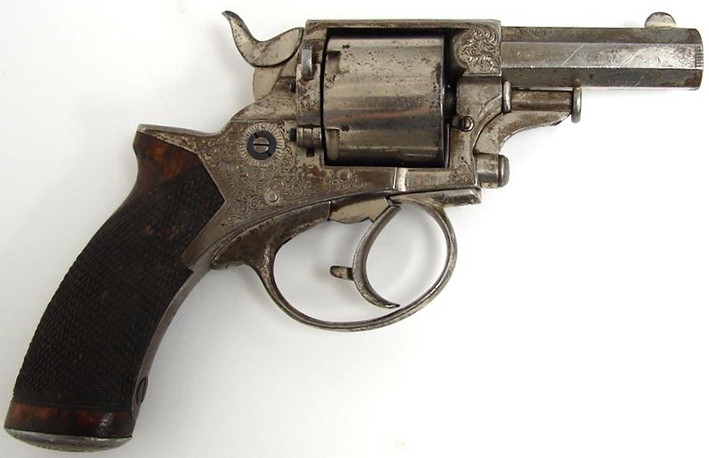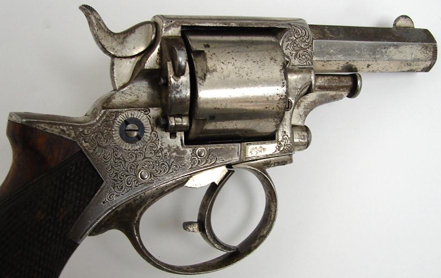 British Tranter Style .450 caliber revolver. Unmarked. Excellent quality revolver, factory engraved with 3 barrel. Measures 8 (ah1957)
