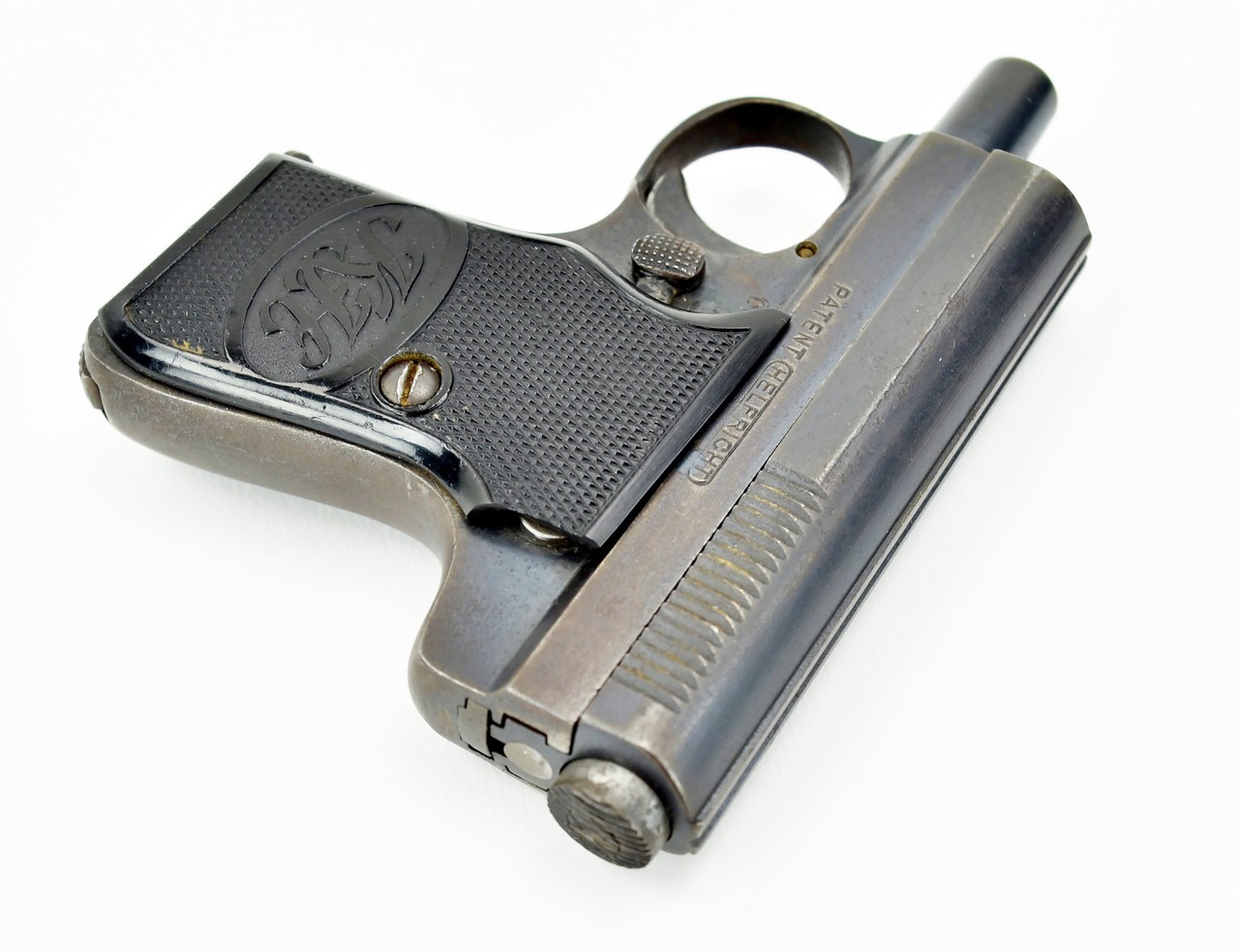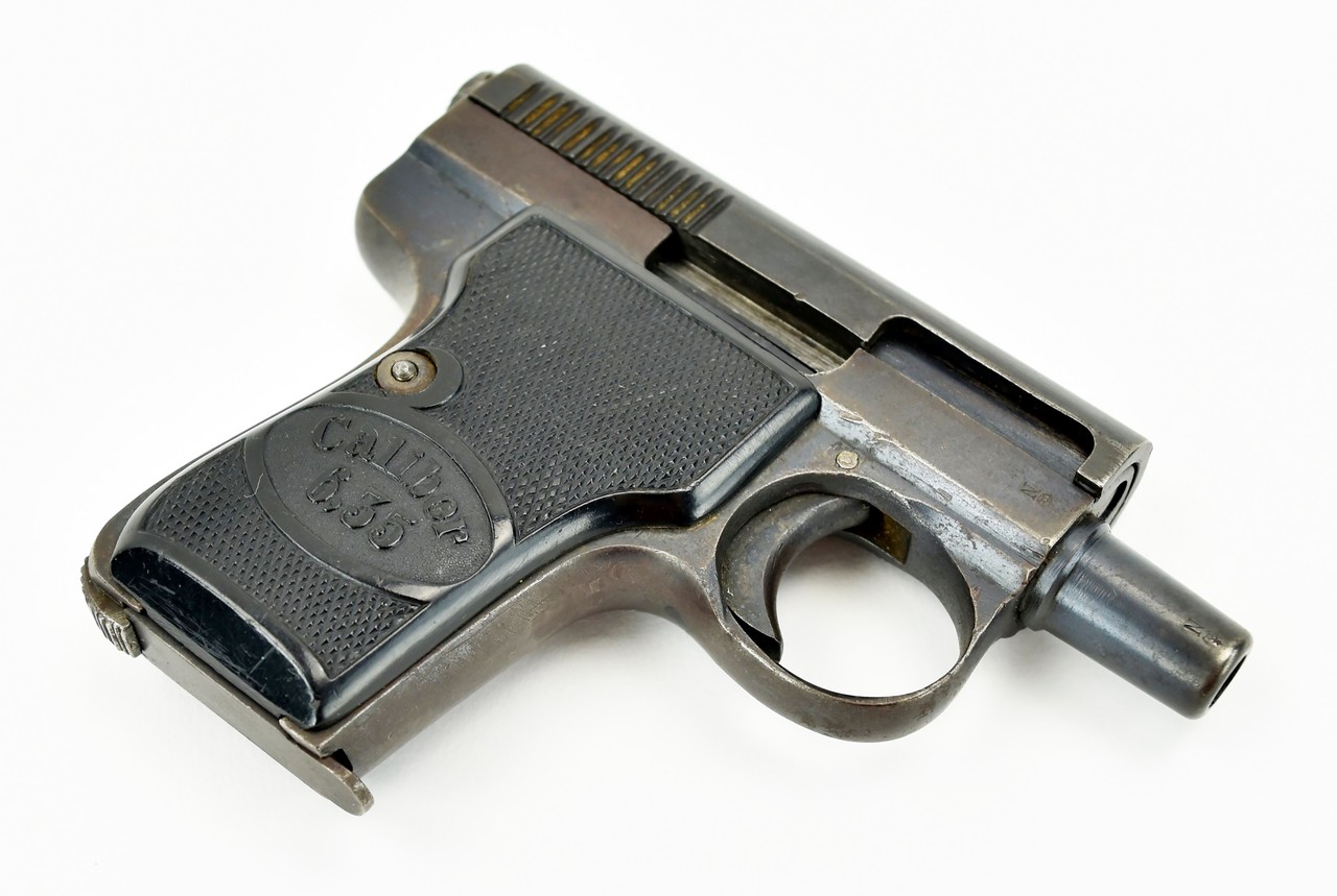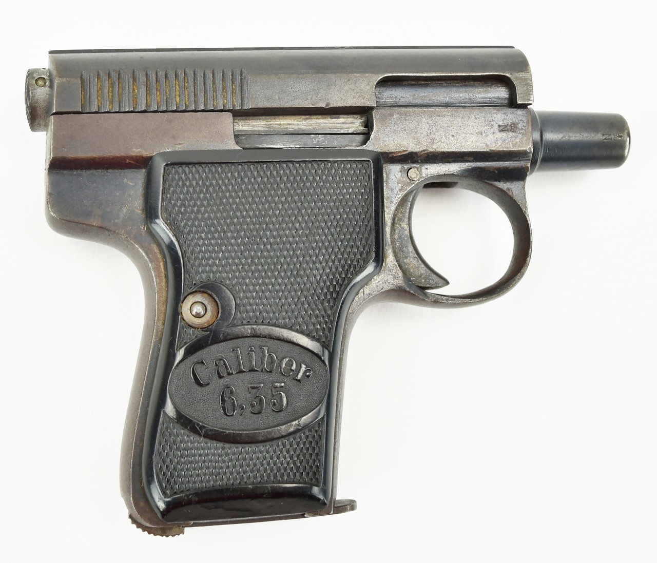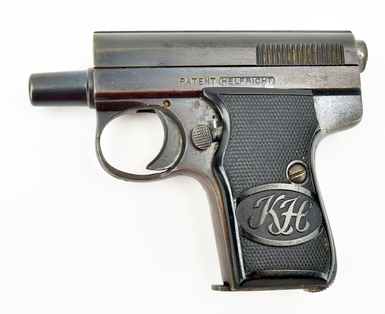 Helfricht model 1 6 .35 caliber pistol. Rare Helfricht patent .25 auto model 1. Good bore. Action works perfectly. Grips are excellent with no chips or cracks. Gun has approximately 90-93% blue. Crown N proof. Neat early design pocket auto.