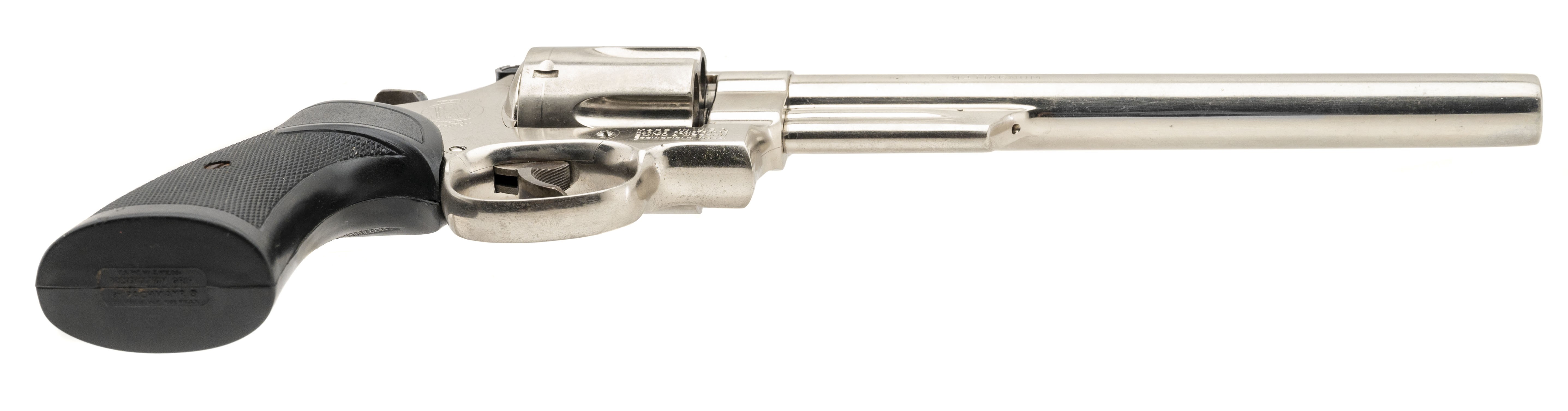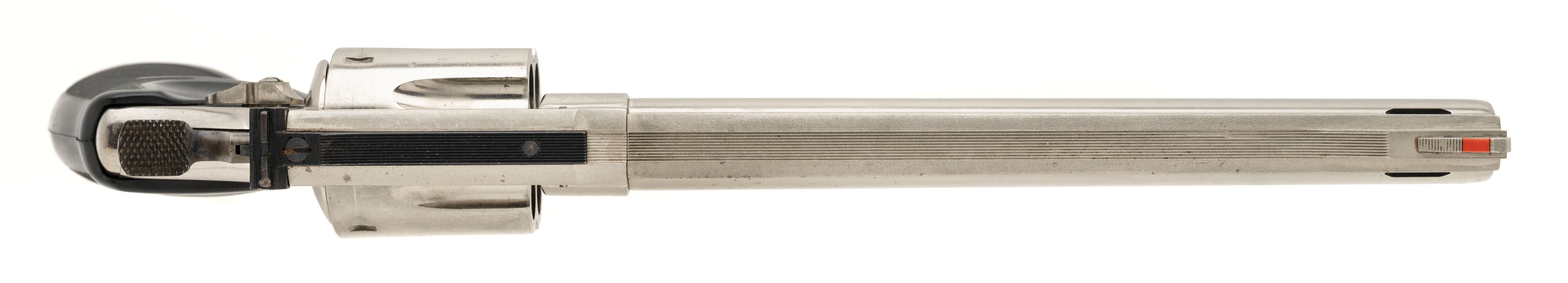 SN: N388764. 70's Vintage. .44 Magnum with a 8.325" pinned barrel. Bore is bright with strong rifling. Double action nickel plated revolver with power ports. Nickel finish is in good condition with wear noted. Pachmayr grips show minor handling wear. Overall very good condition.