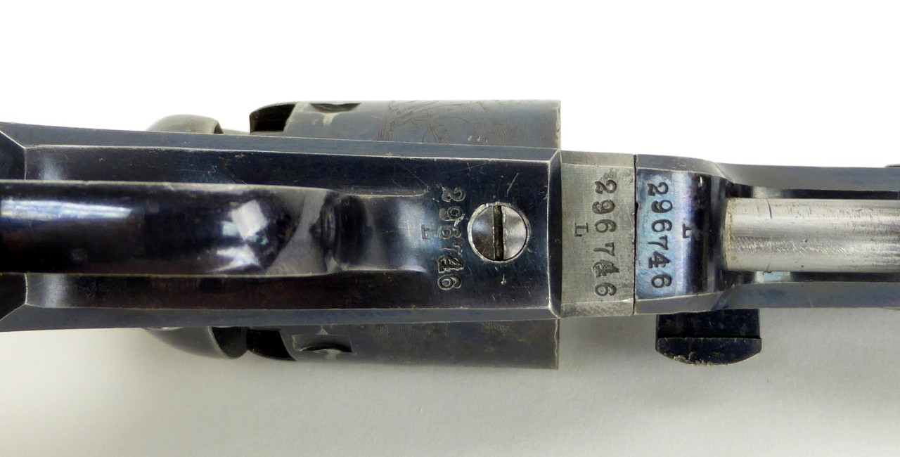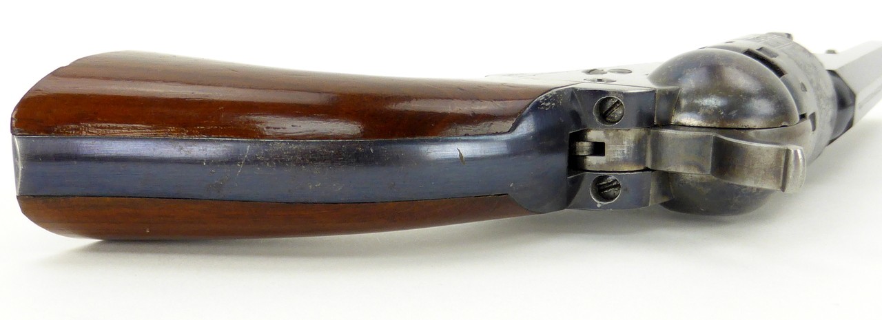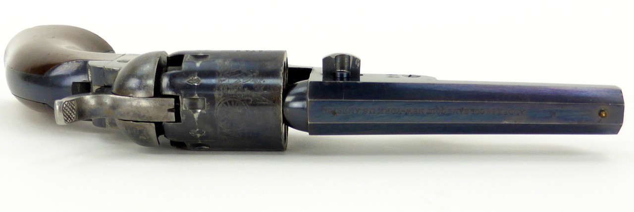 Colt 1849 Pocket .31 caliber revolver. Made in 1860 for the English market. Gun is in near mint condition. Excellent bright original blue and bright original case colors. Cylinder is excellent. Gun is all matching. Grips are near perfect. This gun is certainly good enough to put in a case. This is also an iron back strap and trigger guard. Barrel is 4” long. Beautiful 1849er worthy of a great Colt collection!