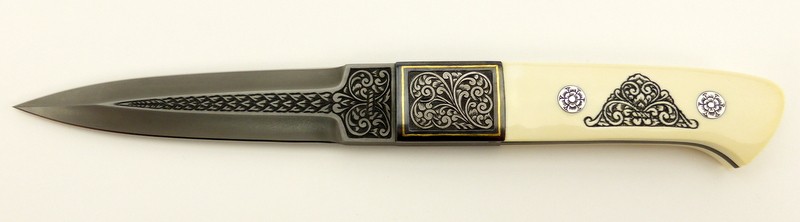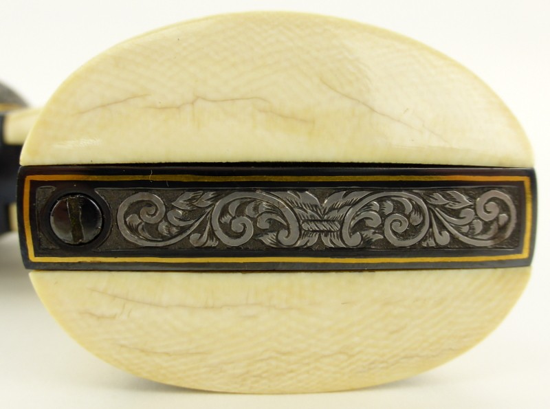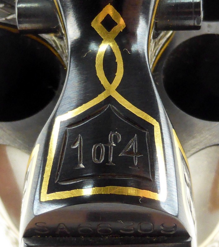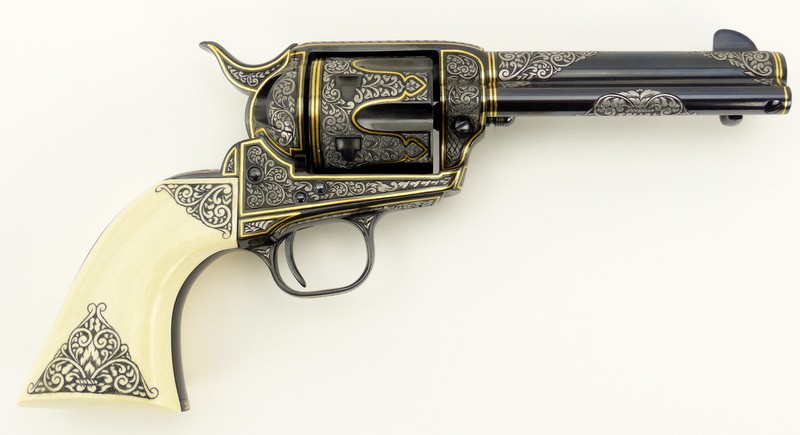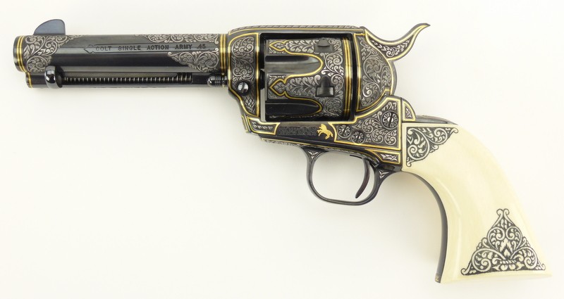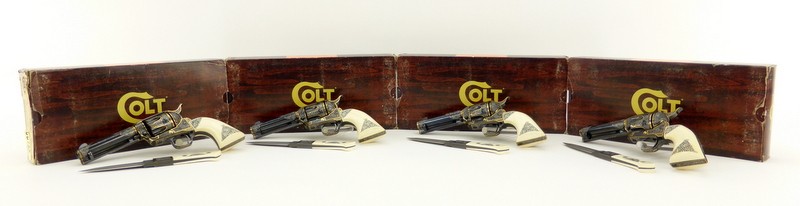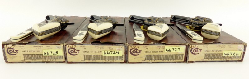 Colt Engraved Single Action Army 4-Gun Consecutive Set Outstanding one of a kind 4-gun consecutive set of 3rd generation Colt Single Actions, elaborately custom engraved by the late Ken W. Warren. The guns are all 4 ¾” models made in 1983, serial numbers SA66309 thru SA66312, and feature contrasting relief scroll on all blue guns with profuse gold border inlay throughout. The ivory one-piece grips are beautifully scrimshawed with matching scroll. Each gun is marked on the front of the frame “1 of 4, 2 of 4”, etc. and signed by Warren on the front of the frame under the base pin. Additionally, each gun comes with a matching custom knife, engraved and gold inlaid with scrimshawed ivory scales just like the gun, and numbered to each gun. The guns are all in mint, unfired condition with the original boxes. A truly unique and impressive set, one of the most beautiful sets of engraved Colts anywhere.