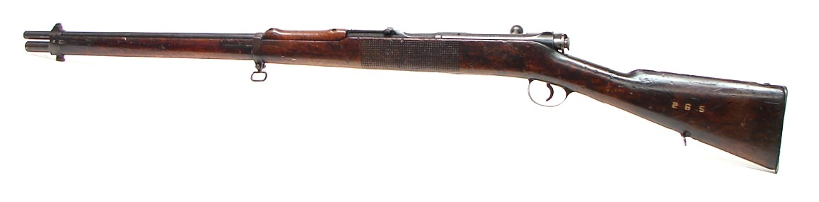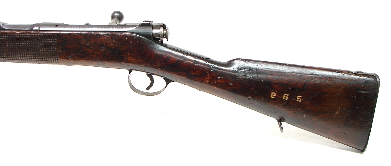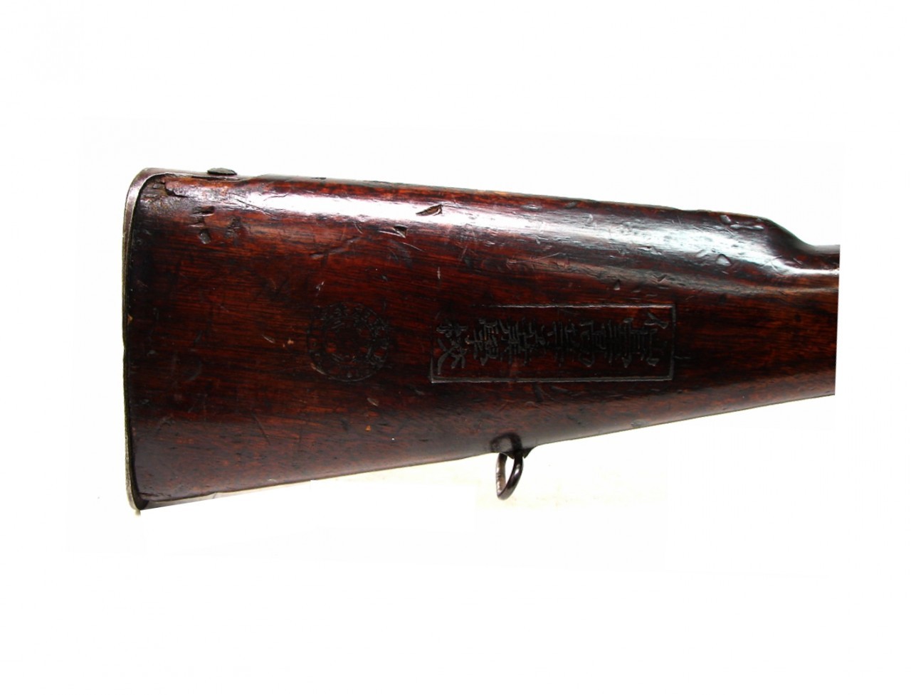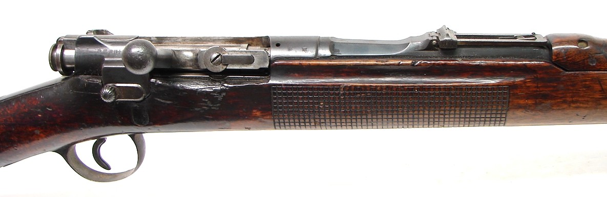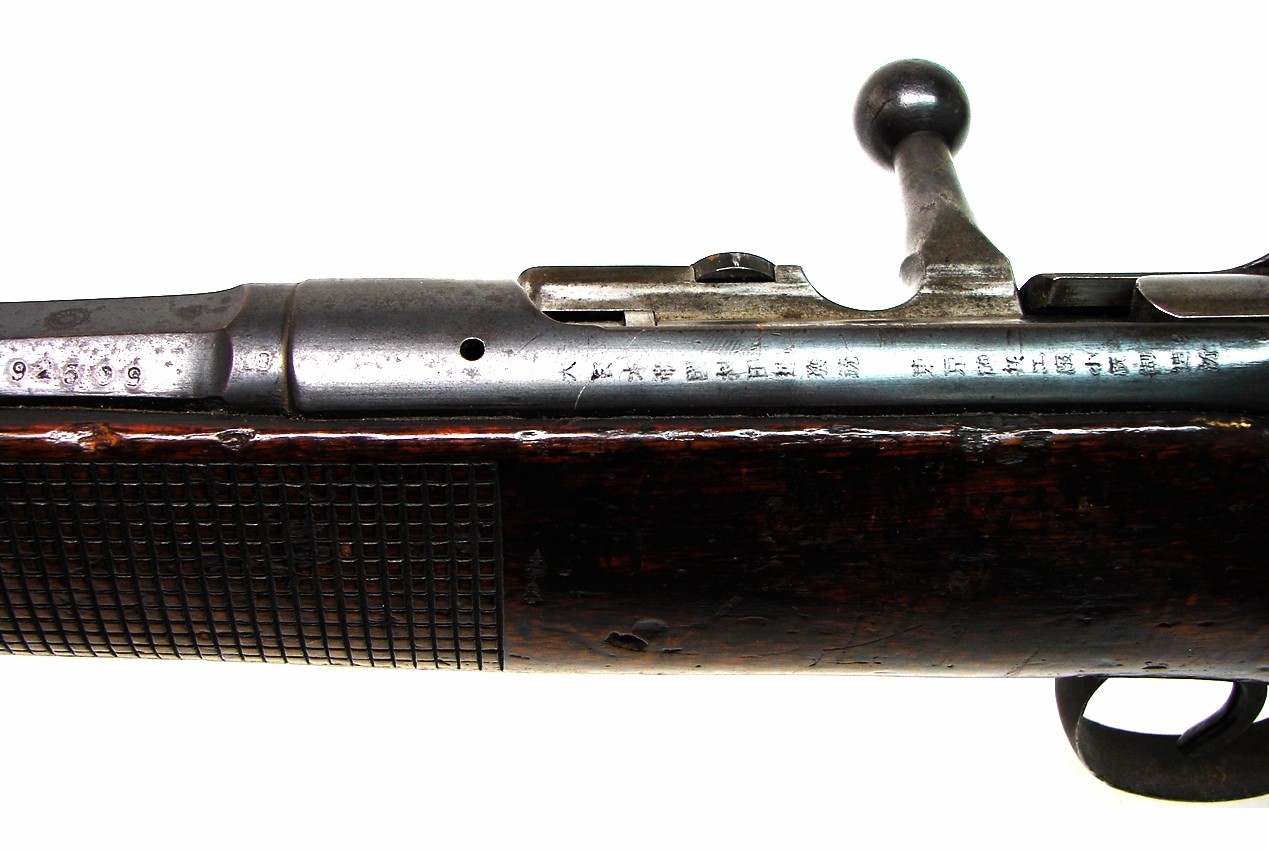 Japanese Murata Infantry Type 22 8x53 R caliber rifle. Rare, this is their first small bore bolt action repeater and was adapted by Japan in 1889. It has a tubular magazine underneath the barrel. Non matching serial numbers. The bore has strong rifling and is dark in the grooves. The wood shows dents and dings with a couple of hairline cracks at the upper tang. Good over all condition and hard to find. Scarce Repeater Murata.