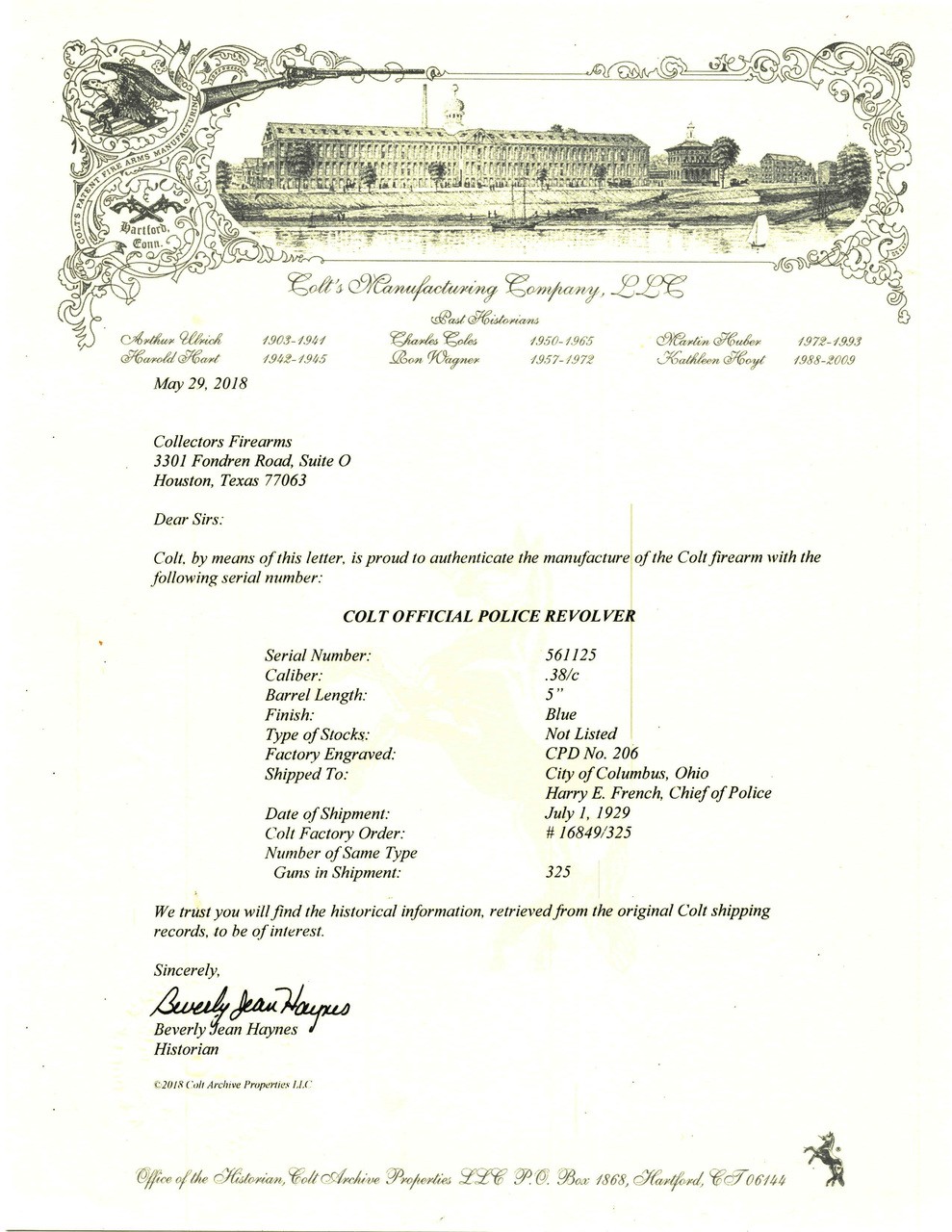 Colt Official Police .38 Special caliber revolver. Made in 1929 and shipped to the Chief of Police, Columbus, Ohio. Bore is excellent. 5” Barrel shows some carry wear, otherwise very good overall condition. A 1930’s vintage Police revolver (Butt is marked CPD No. 206). Comes with factory letter.