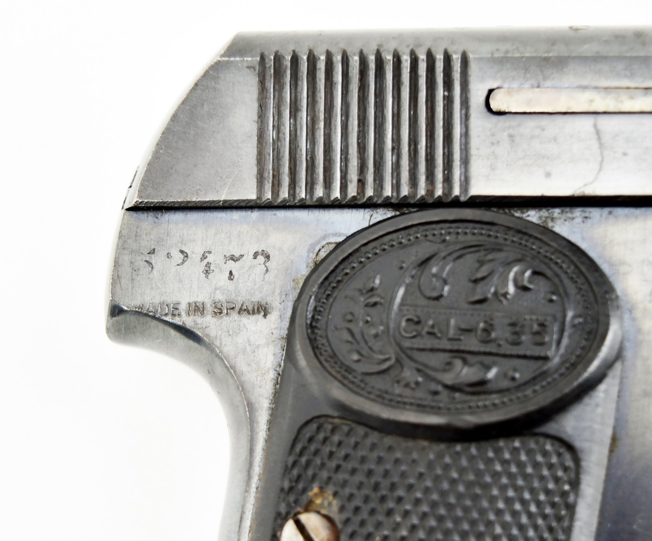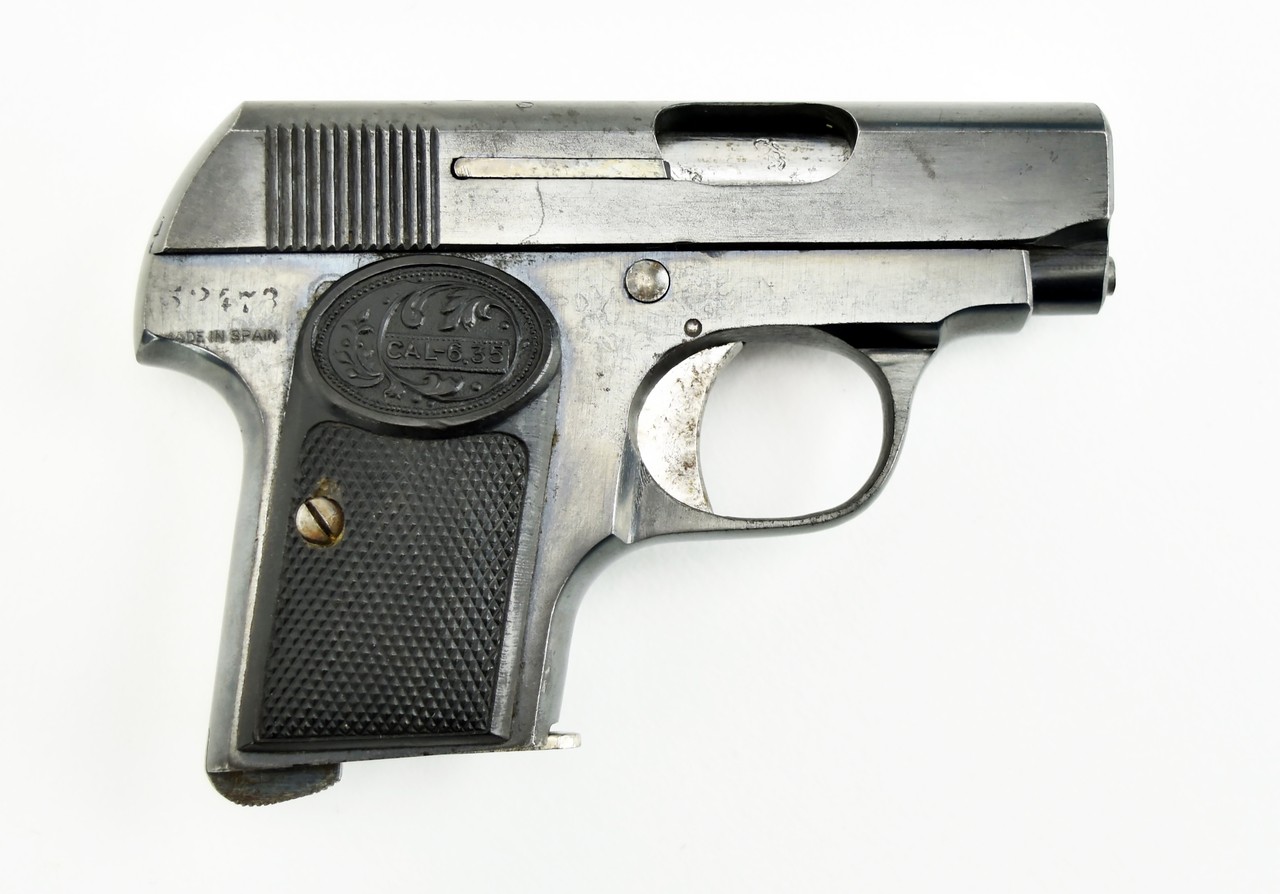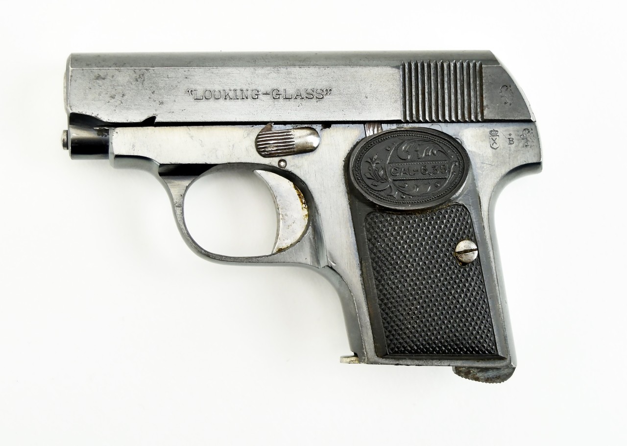 Spanish Looking Glass 6.35 caliber pistol. Excellent bore. Action works perfectly. Gun has 98% original blue. Grips are mint. Near mint looking glass. .25 Auto circa 1925.
