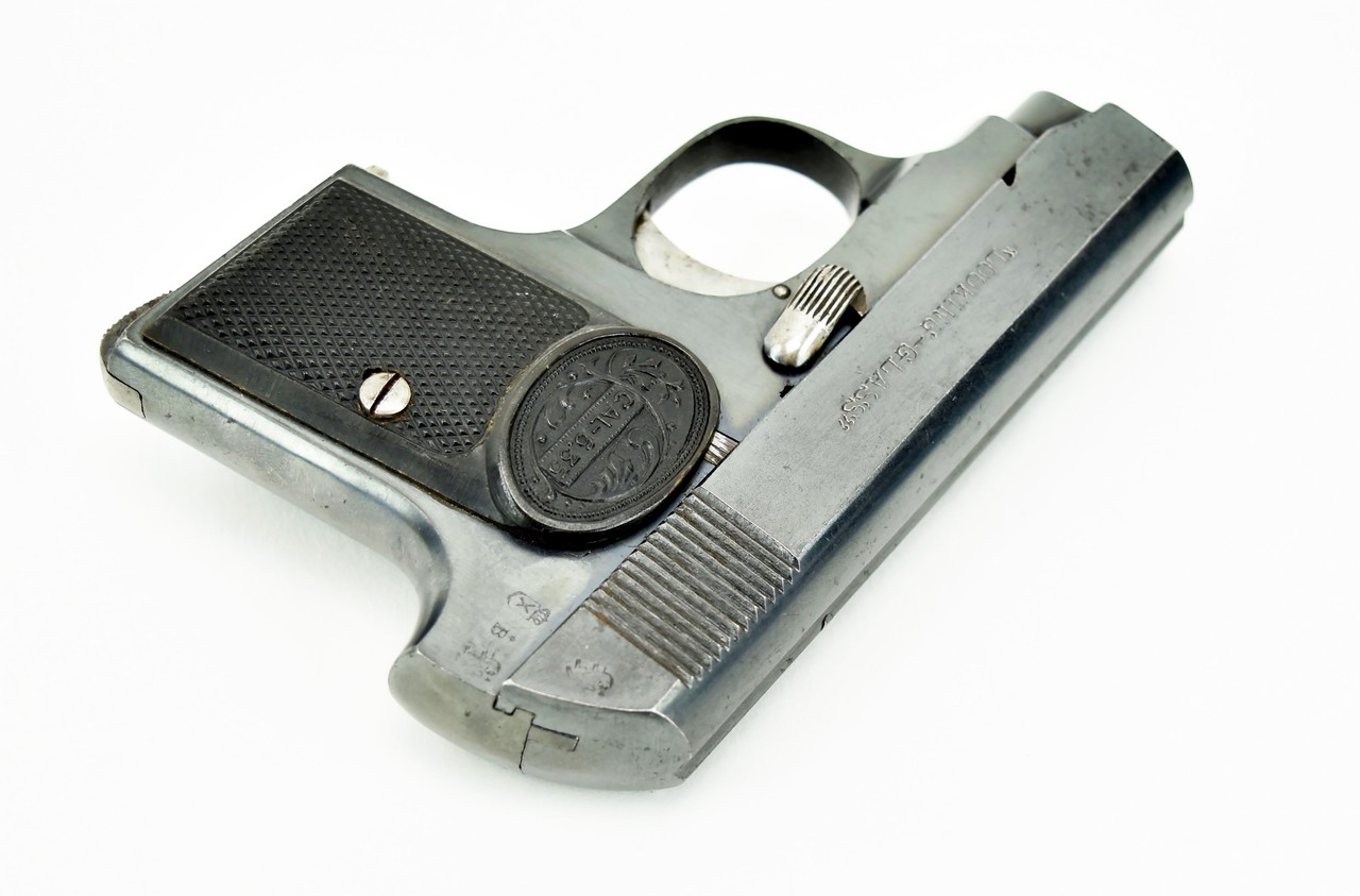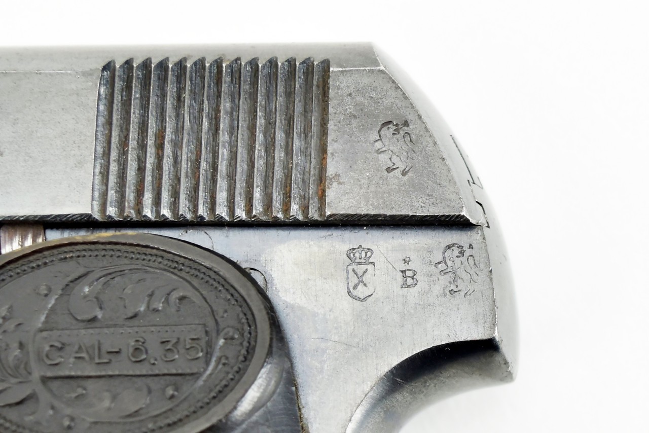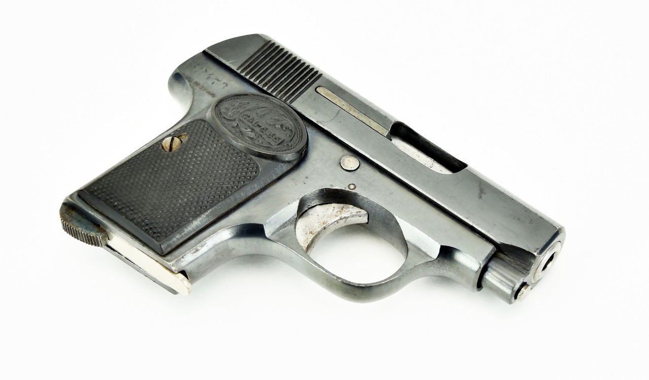 Spanish Looking Glass 6.35 caliber pistol. Excellent bore. Action works perfectly. Gun has 98% original blue. Grips are mint. Near mint looking glass. .25 Auto circa 1925.