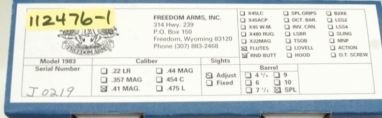 Freedom Arms 83 Premier .41 Rem caliber revolver. Special model with 4 barrel, round butt grip & fluted cylinder. New.
