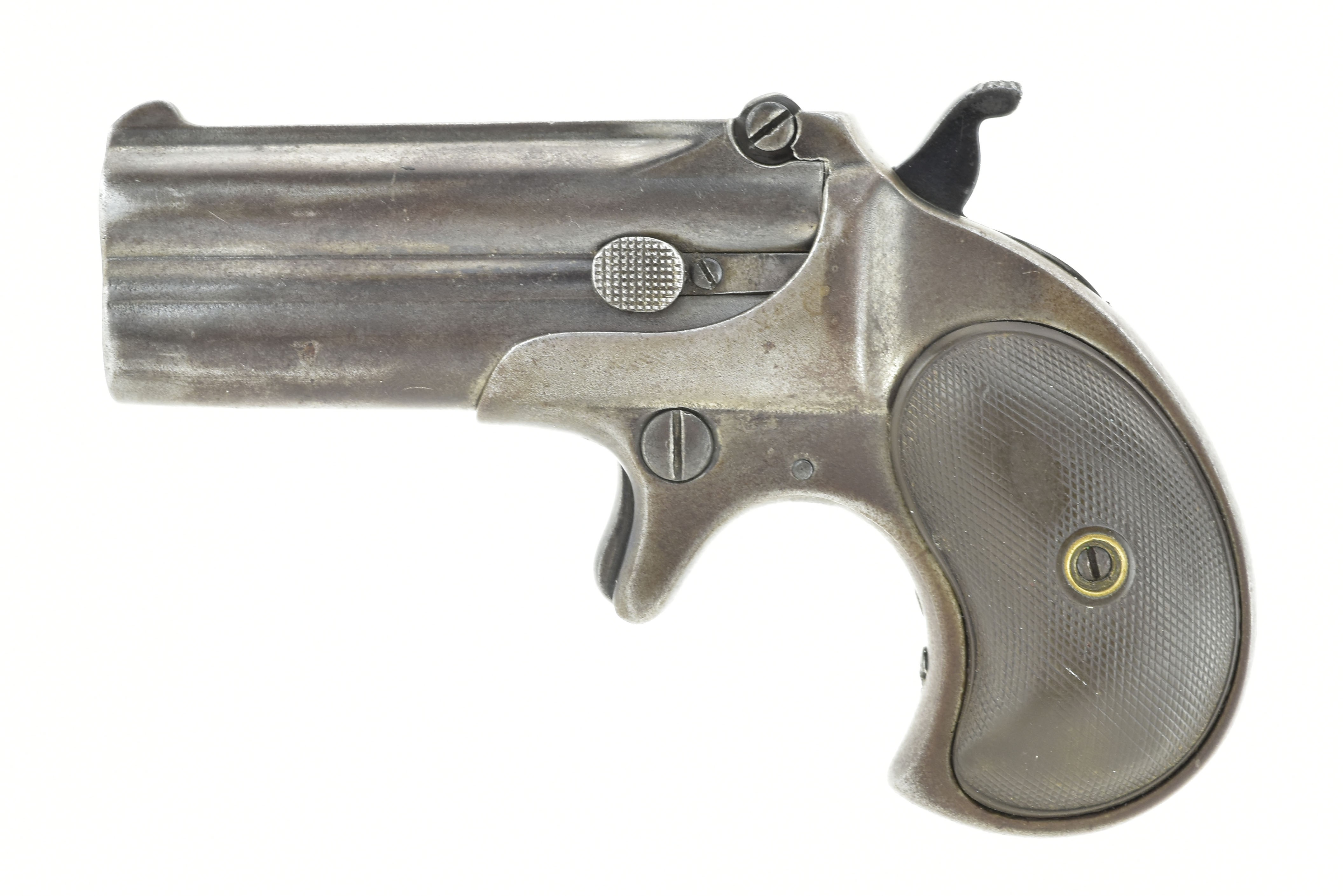 Remington over/under .41 R.F. caliber pistol. Hinge broken on left side, though the right side is ok. Action works fine. Barrel locks up fine. Bore is rough. Reasonably price.