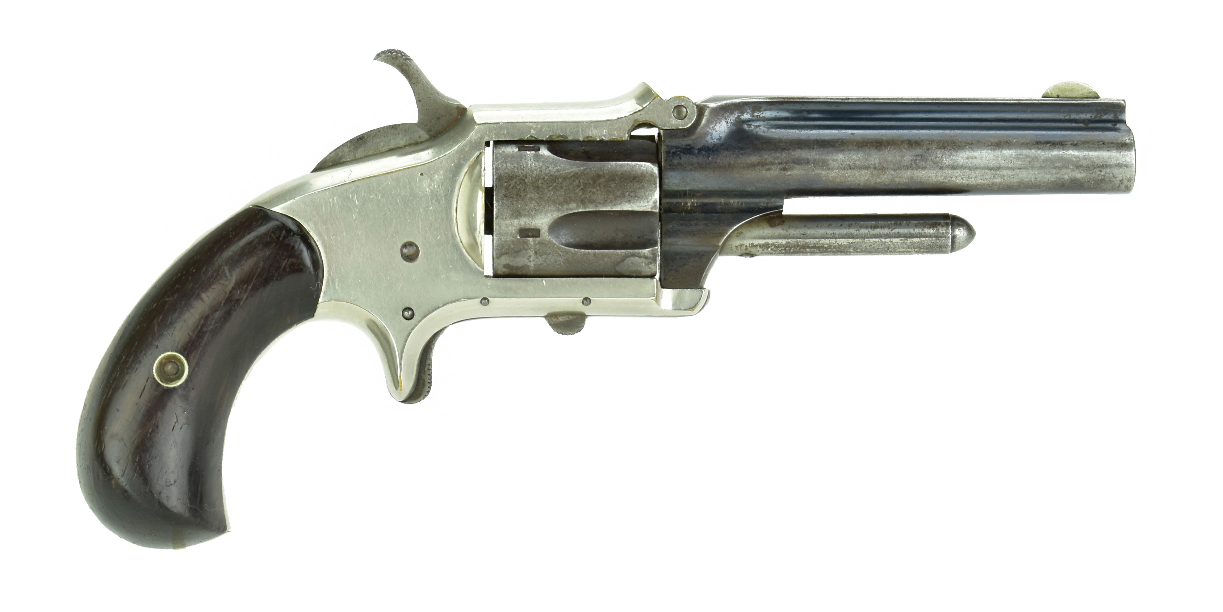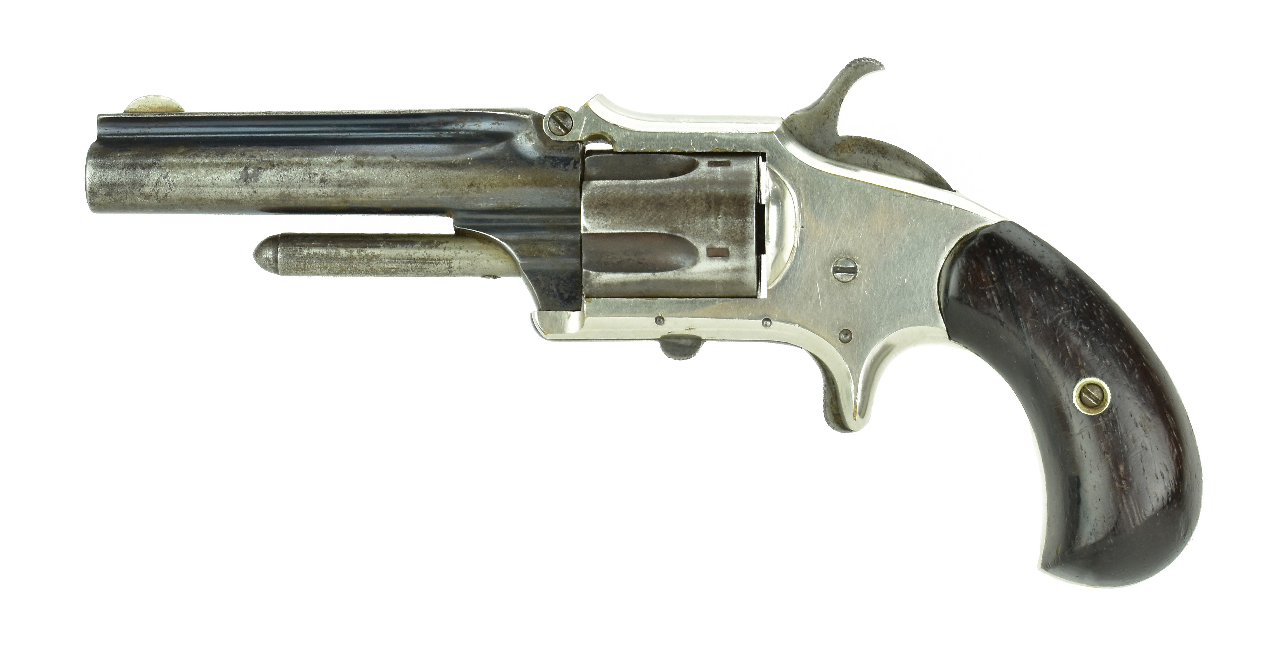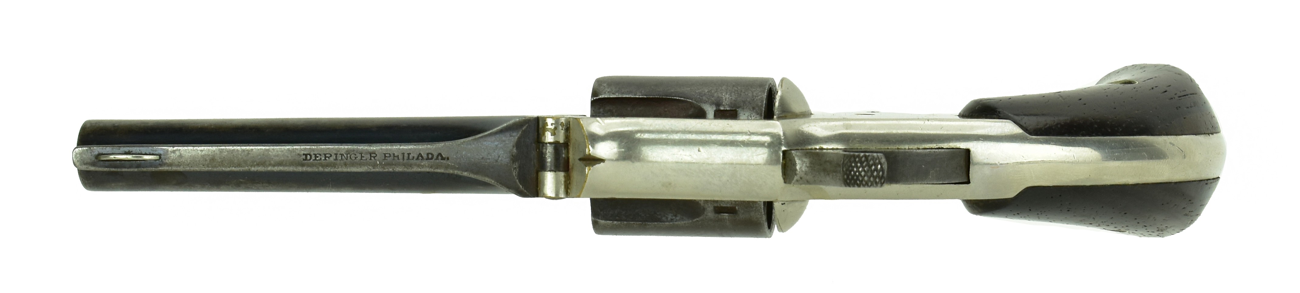 Deringer .32 Caliber Pocket Revolver. Made in 1876. .32 Rimfire with a 3 ½” barrel. Very nice original condition with 95% of the original nickel finish. 20% of the original blue finish on the barrel in protected areas. Grips are excellent.