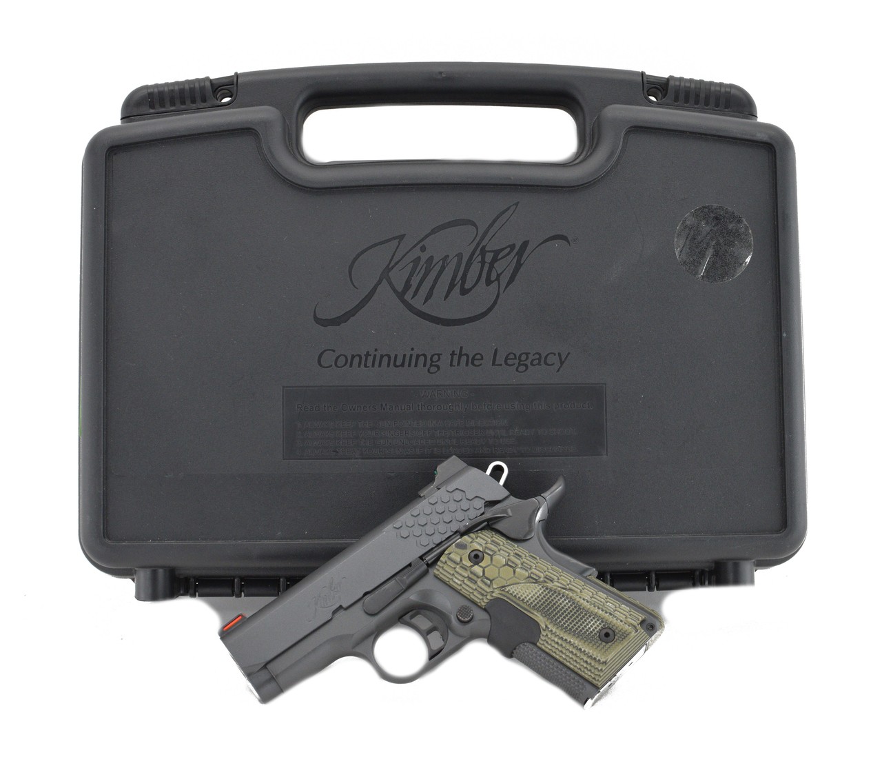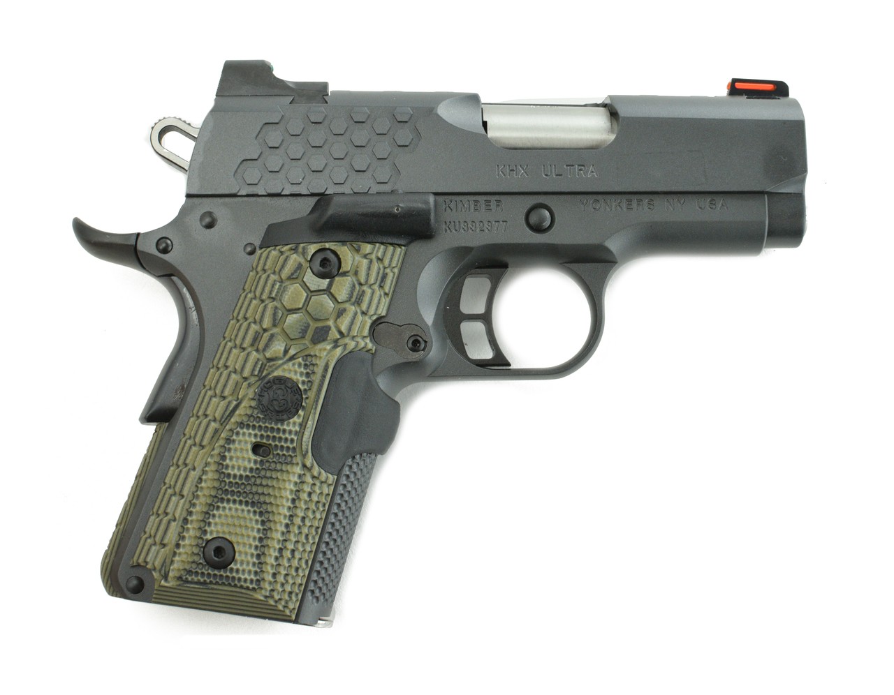 Kimber KHX Ultra 9mm caliber pistol. 3” Model with gray finish, laser grips, and hex slide serrations in excellent condition with box.