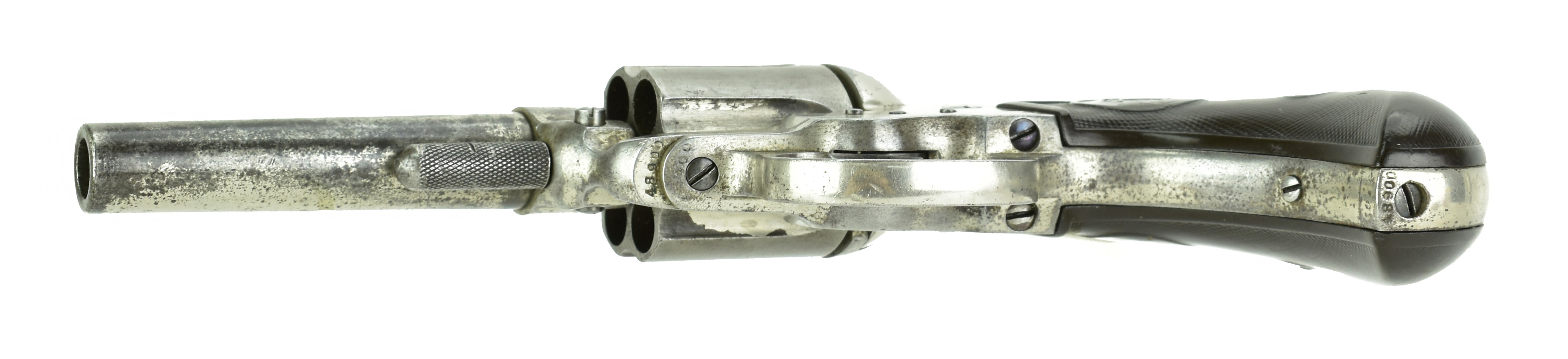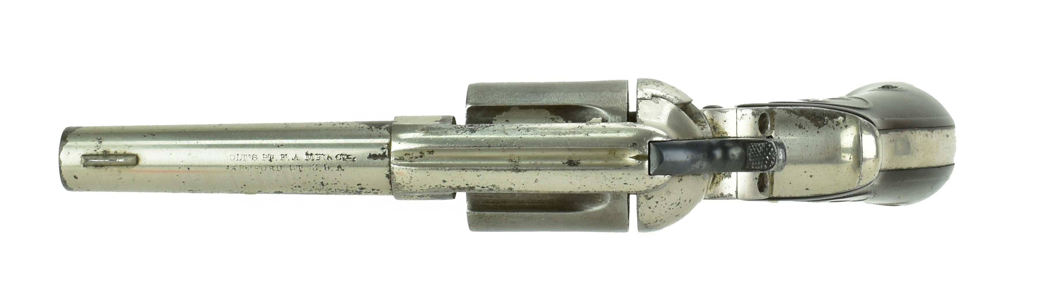 Colt Model 1877 Lightning Sheriff’s Model Revolver. Made in 1884. .38 Caliber with a 3 ½” barrel. 70% of the original nickel finish. Some of the etched panel still remains. The grips show a fair amount of handling wear.