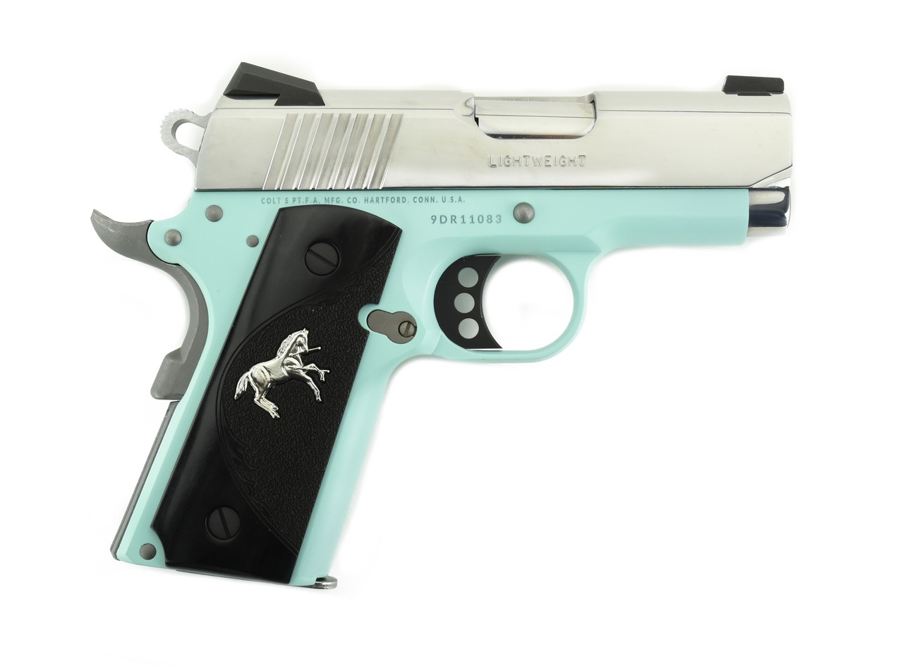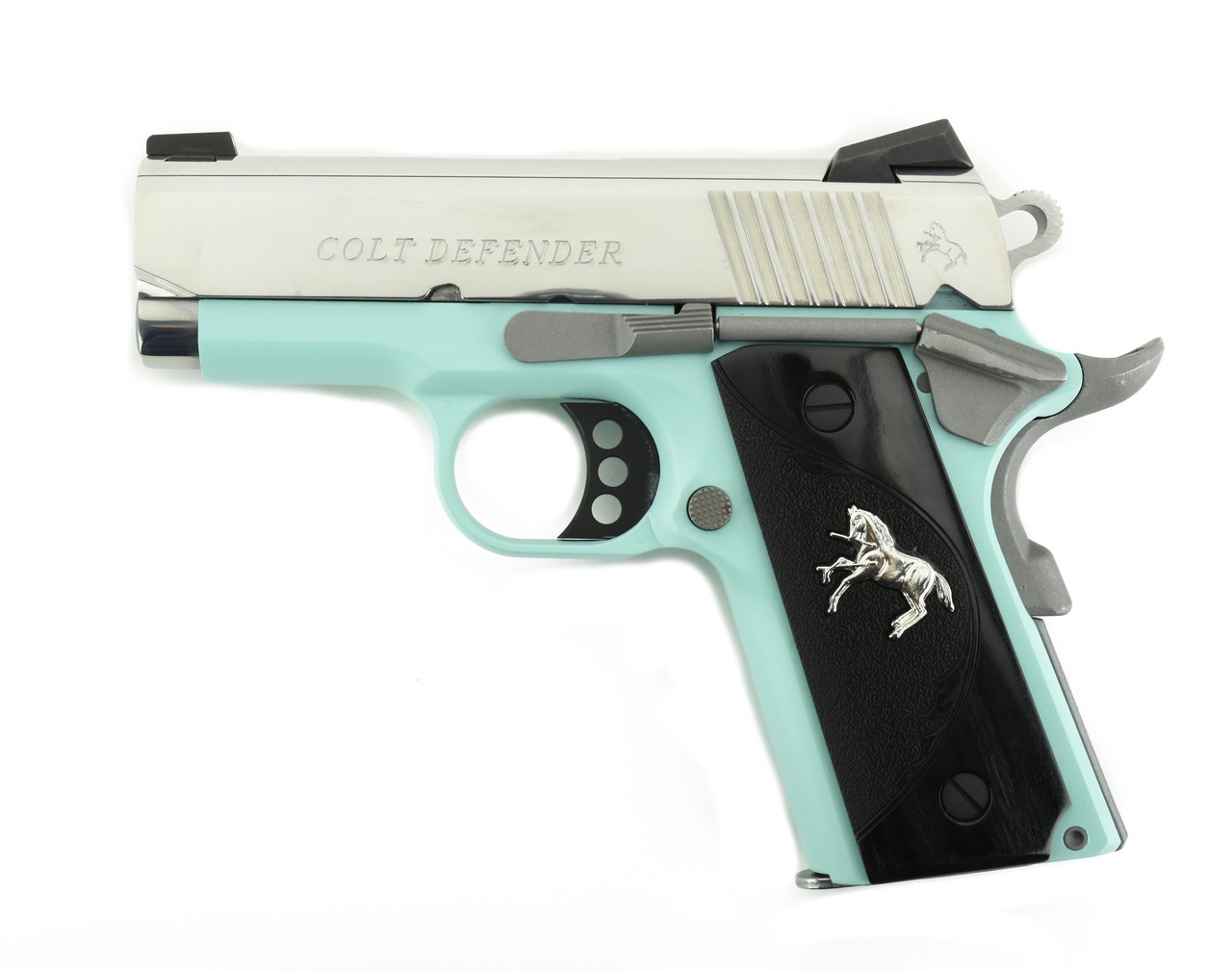 Colt Defender Lightweight 9mm caliber pistol. Special Edition with polished slide and Tiffany blue frame. A beautiful piece. New.