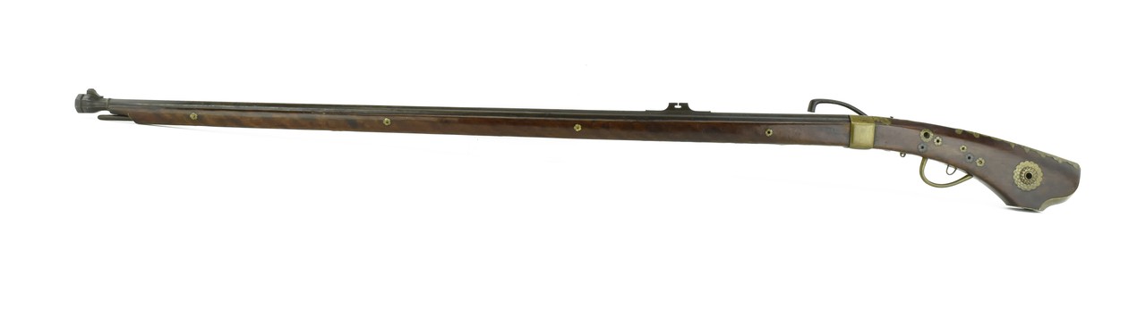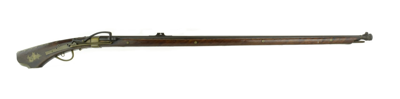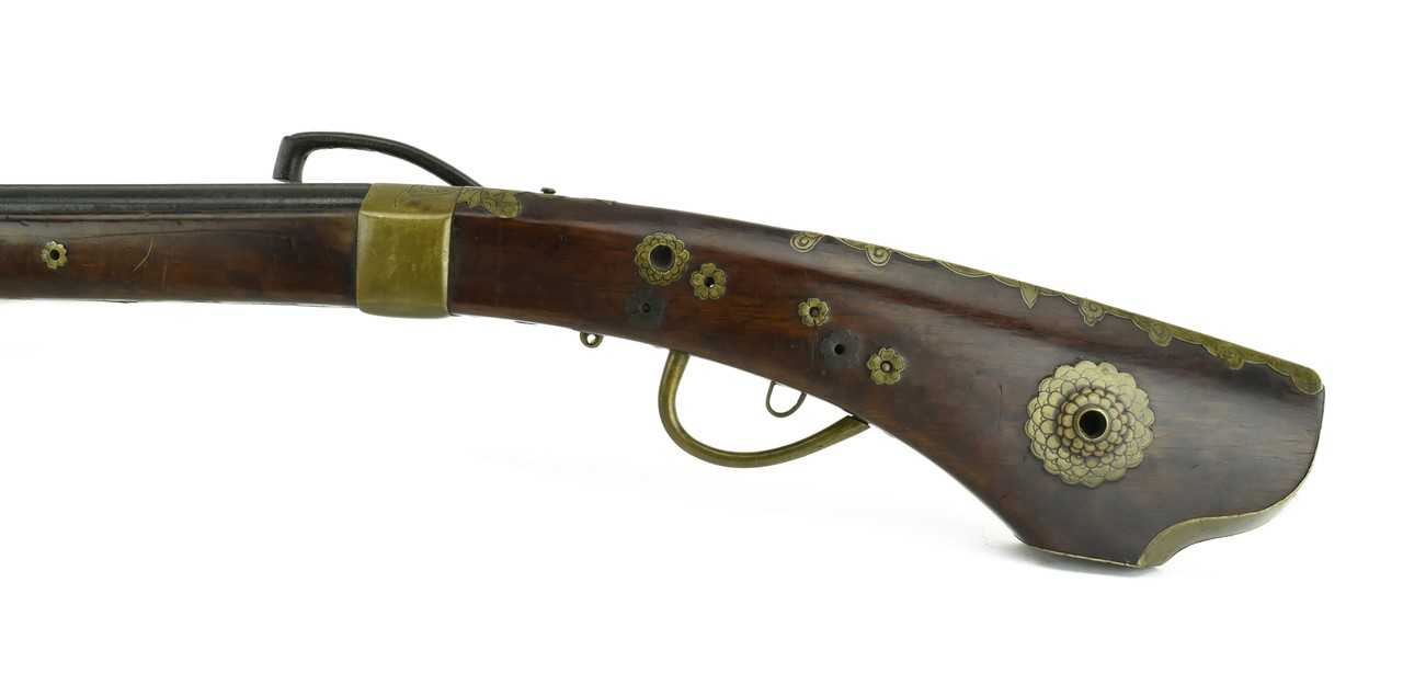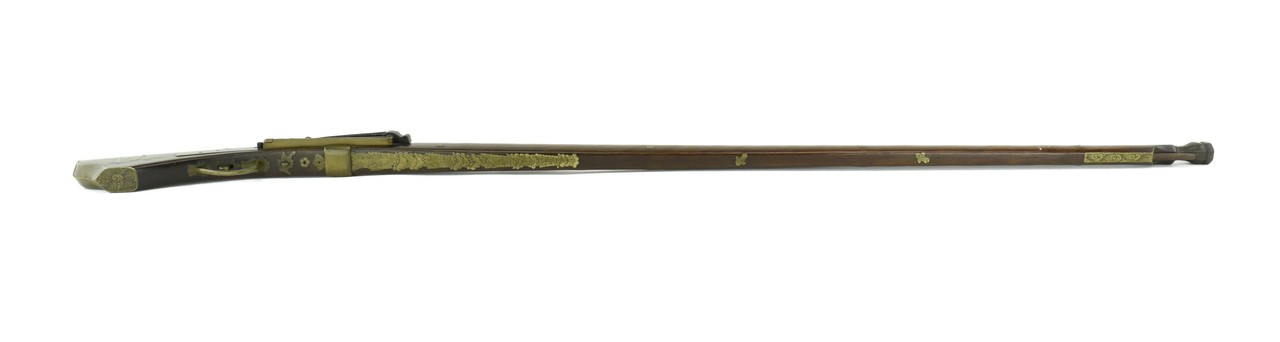 Japanese “Tanegashima” Matchlock Rifle. Barrel length 40”, overall length 51 ½”. Tulip shape flared muzzle. Various engraved brass inlay such as birds, samurai helmet, dragon, sacred pearl, Shi-Shi dog, and flowers. Action works perfectly. Fine condition.