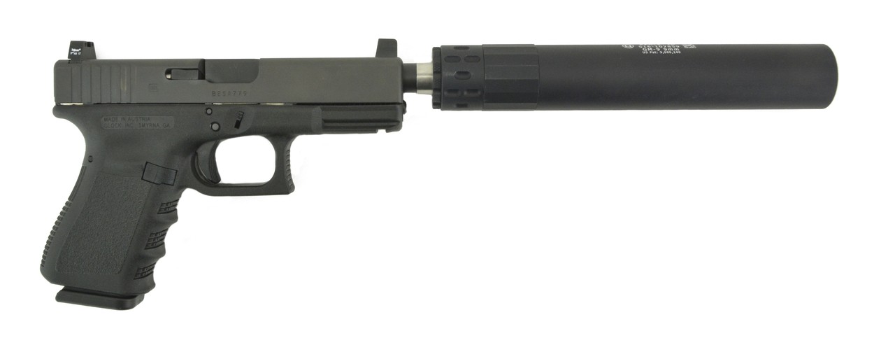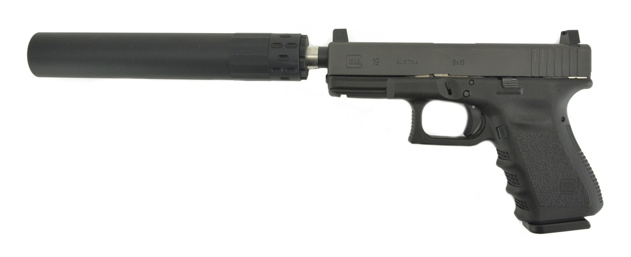 Glock 19 with Gemtech GM-9 Suppressor 9mm caliber pistol. A Glock 19 Gen 3 bundled with an Agent Wolf barrel, Trijicon suppressor sights and a Gemtech GM-9 to make a great night stand package. New. Class III item. NFA rules do apply.