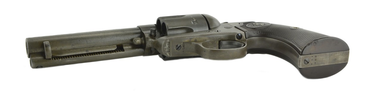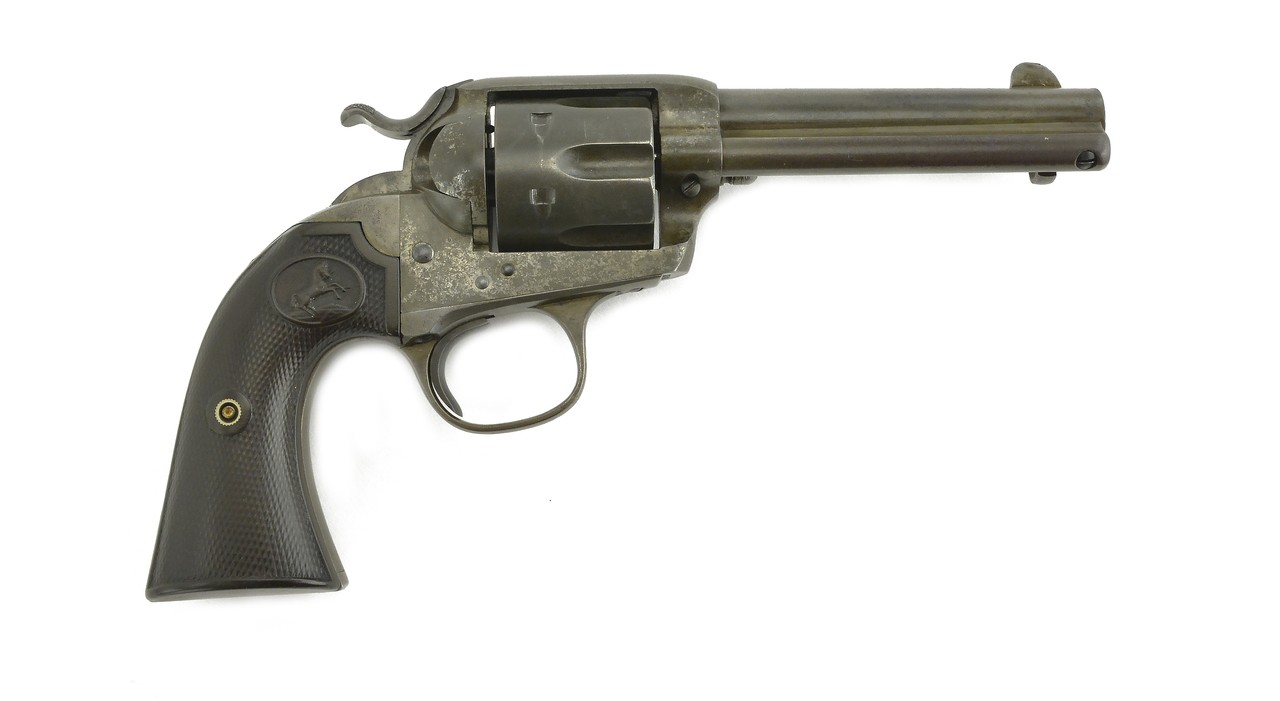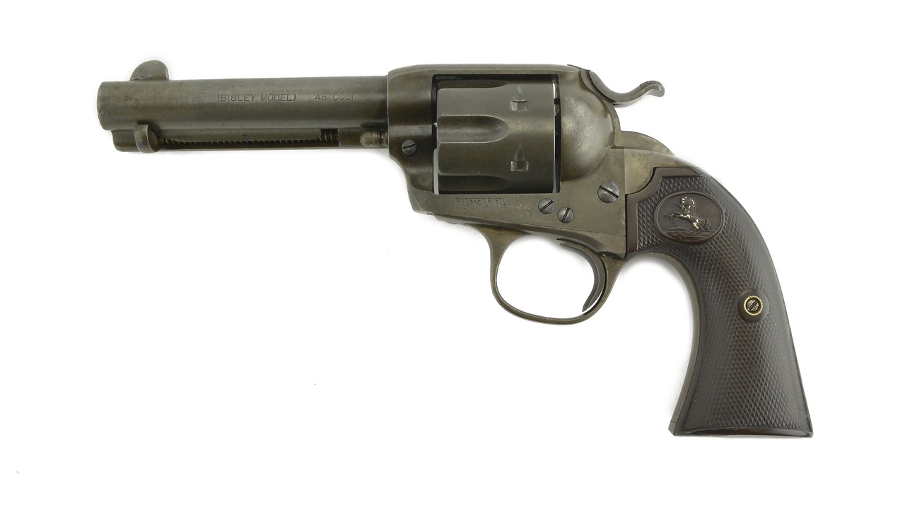 Colt Bisley .45 Colt caliber revolver. Barrel length 4 ¾” with excellent bore. Made in 1906. The finish is a light grey patina. Markings are clear. Action works and indexes perfectly. Grips are very good plus with no chips or cracks. Crisp Bisley in popular .45 Long Colt!