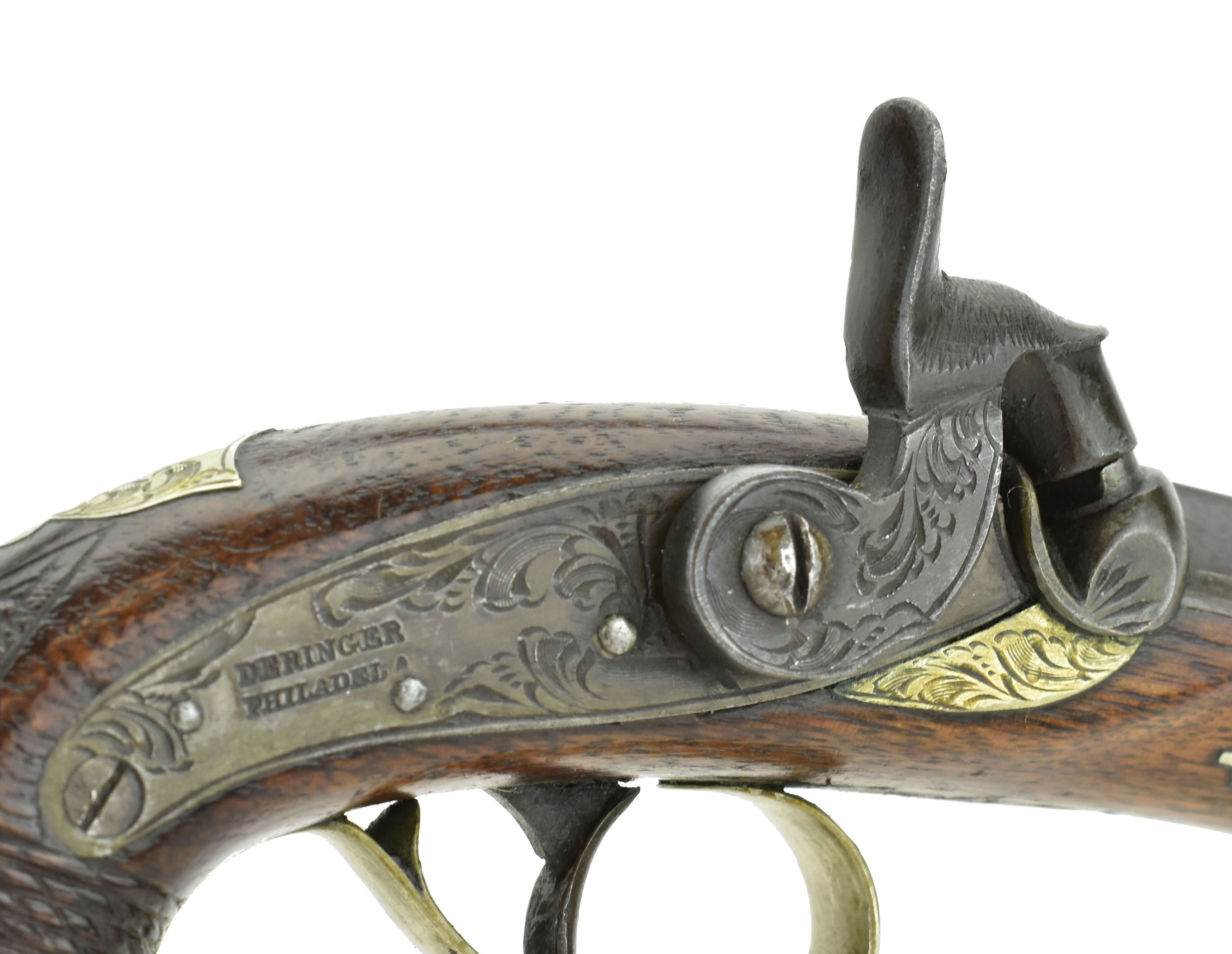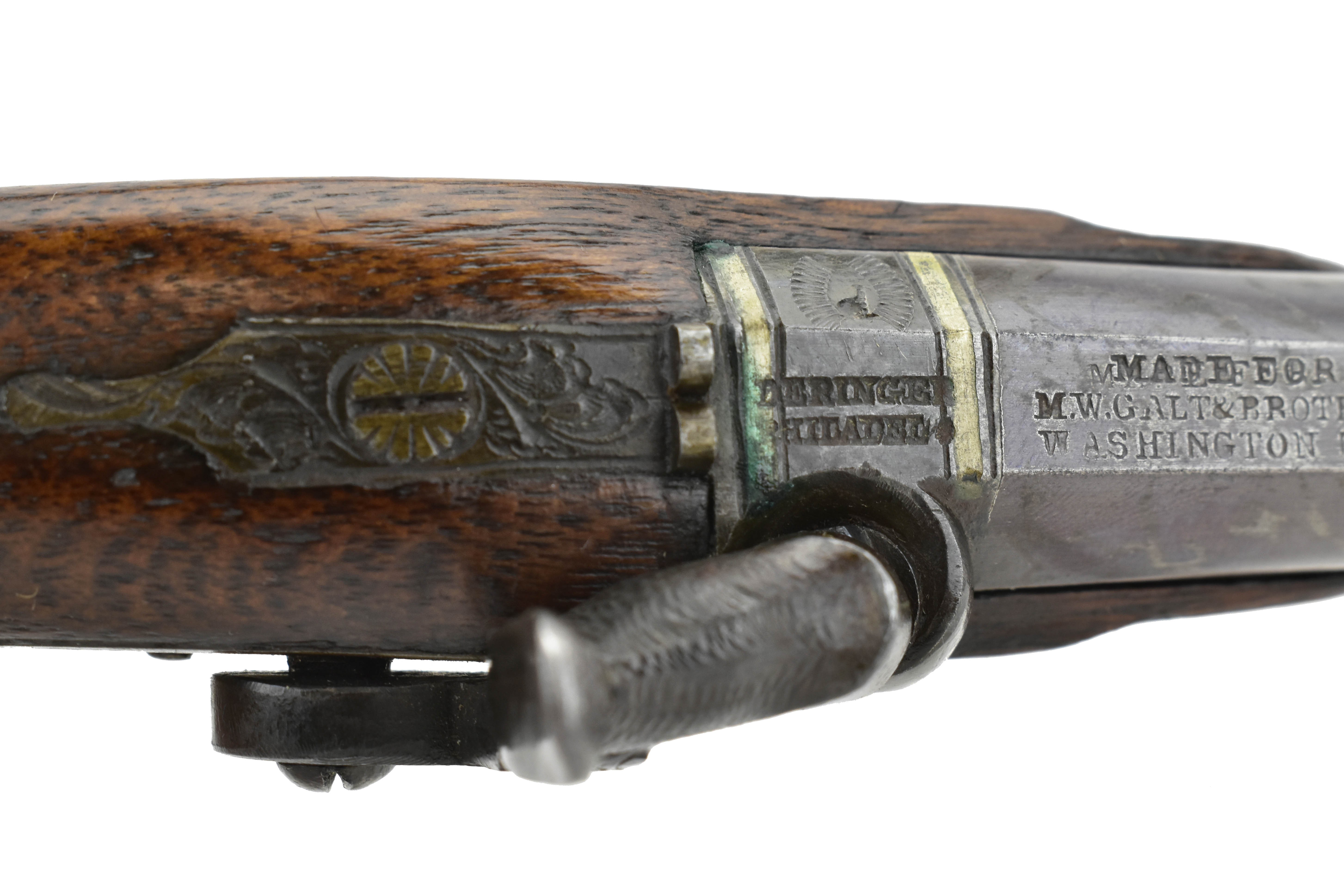 Excellent Henry Deringer Peanut M.W. Galt Retailer Marked. .40 Caliber with a 1 ½” barrel, 5” overall length. Barrel has excellent original finish with all of the original brown striping. Furniture is all nicely engraved. Breech has two silver bands. Wood is excellent and checkering is sharp. Top of the barrel is marked “Made For/M.W. Galt & Brother/Washington D.C.”. This is a seldom seen retailer of Henry Deringer. Condition is excellent.