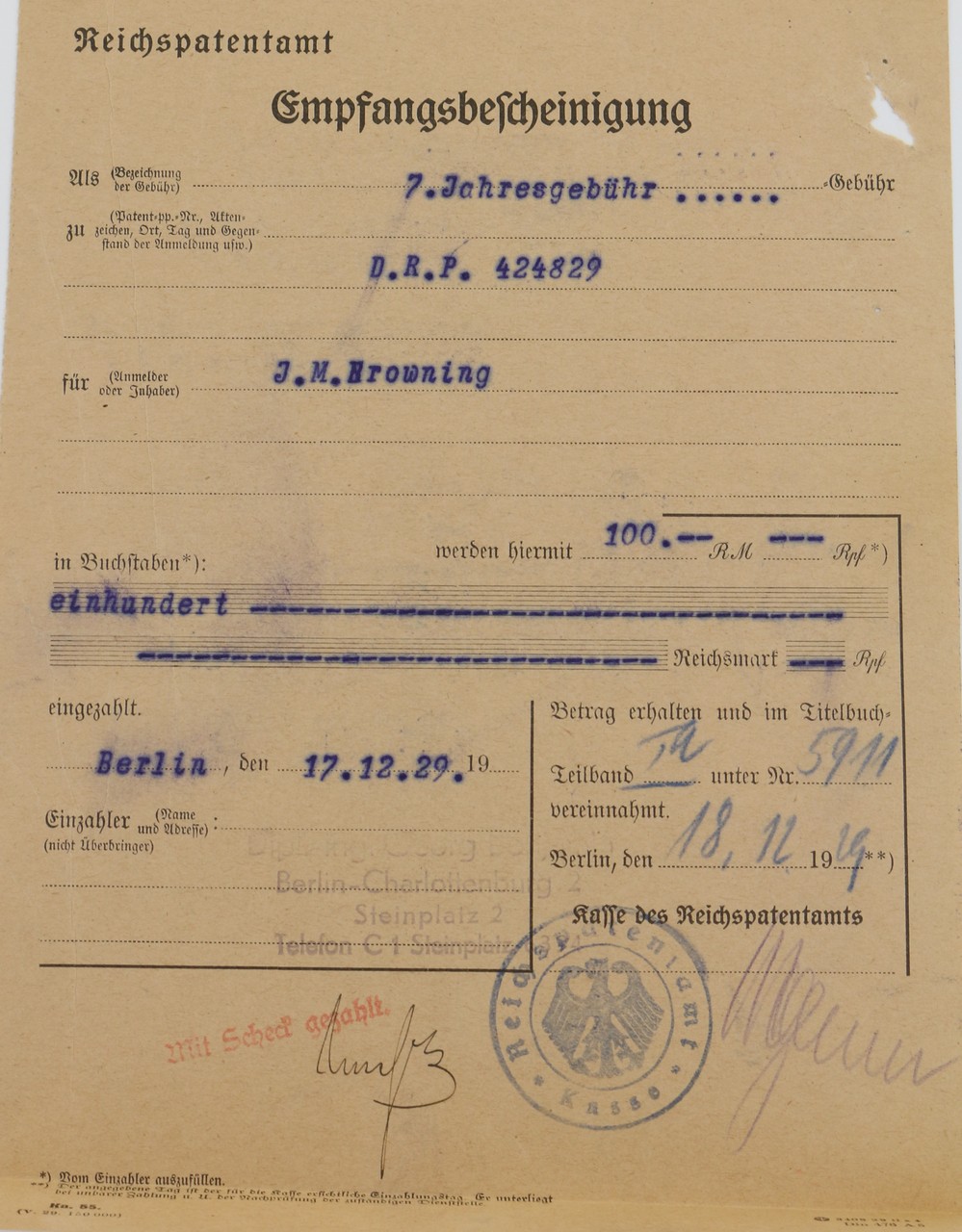 Browning’s German Patent Paperwork. Empire dated 11-26-1928.