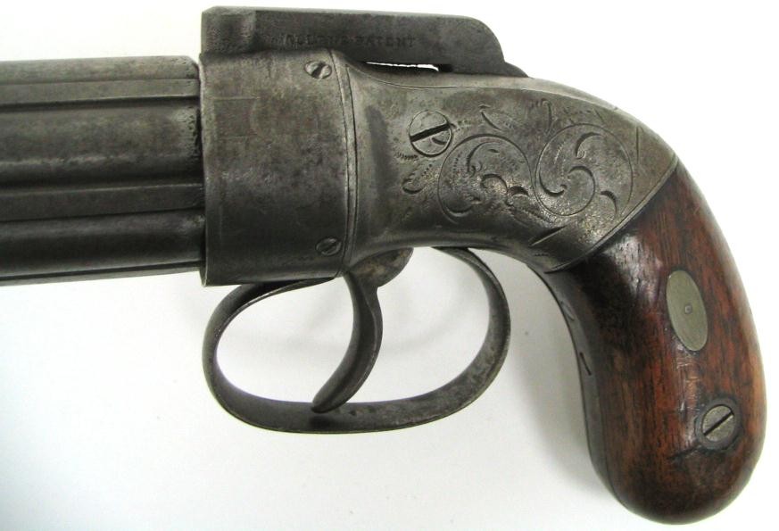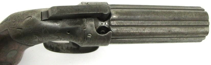 Allen & Thurber medium size pepperbox. Mechanically works fine. A sharp gun with blue gray finish & etched nipple shield. (ah1474)