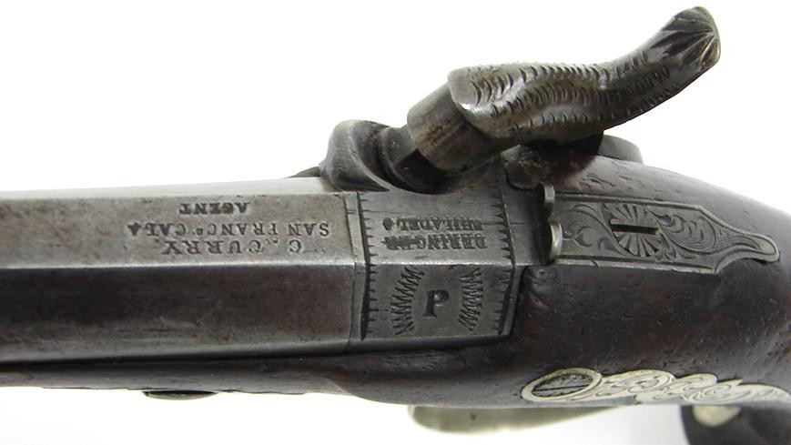Henry Deringer Percussion with 1 7/8 barrel to front of breech plug. Marked on barrel C. Curry San Fran Cala Agent. Very nice California agent marked derringer.