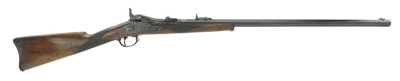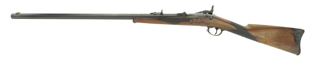 Springfield Trapdoor Sporting .45-70 caliber rifle. Sporting rifle. Barrel length is 30” and overall length is 49”. The action is from a military Springfield, serial # 2480. Bore is good to very good showing wear. Many conversions for Buffalo Hunters were made on these actions with the stocks in this configuration. Rear sight is a Rocky Mountain buckhorn with adjustable ladder. Front sight is German silver ramp. Stock is good plus. Buttplate is “U.S.” marked. The stock at the buttplate has dark stains. Very colorful 1870-1880 Hunters rifle priced reasonably.