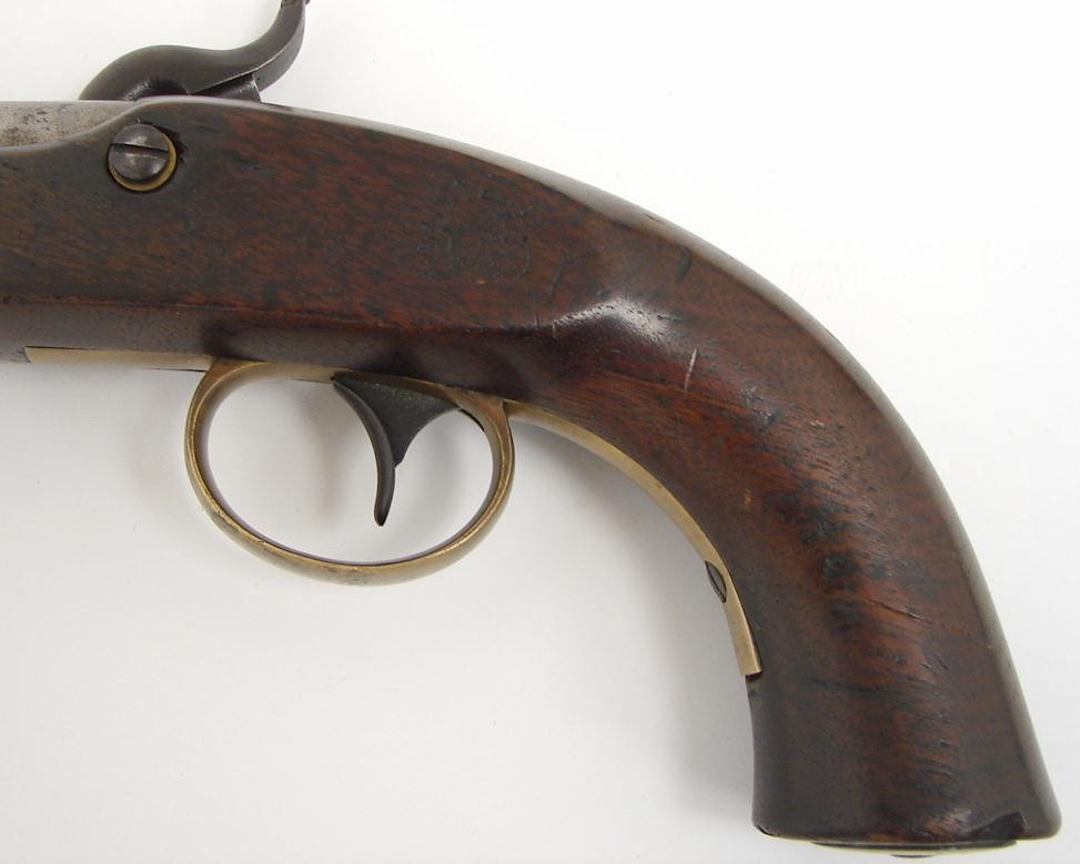 US Model 1842 Naval percussion pistol. Smooth gray and brown patina on metal. All markings are sharp and clear. Cartouche is still visible. Repair to grip, but no danger grip breaking a 2nd time. Desirable US naval gun.