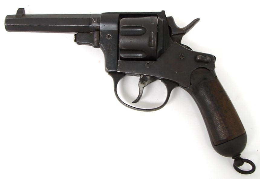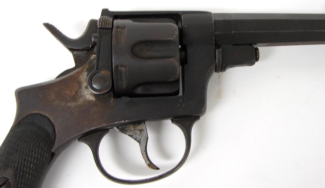 Italian model 1889 service revolver 10.4MM caliber. The bore is good. Brown patina with 15% blue. Produced by Glisenti in 1894. The trigger was broken and has been welded. Works well.