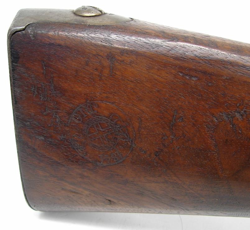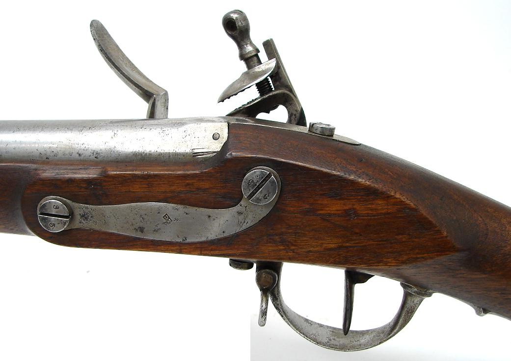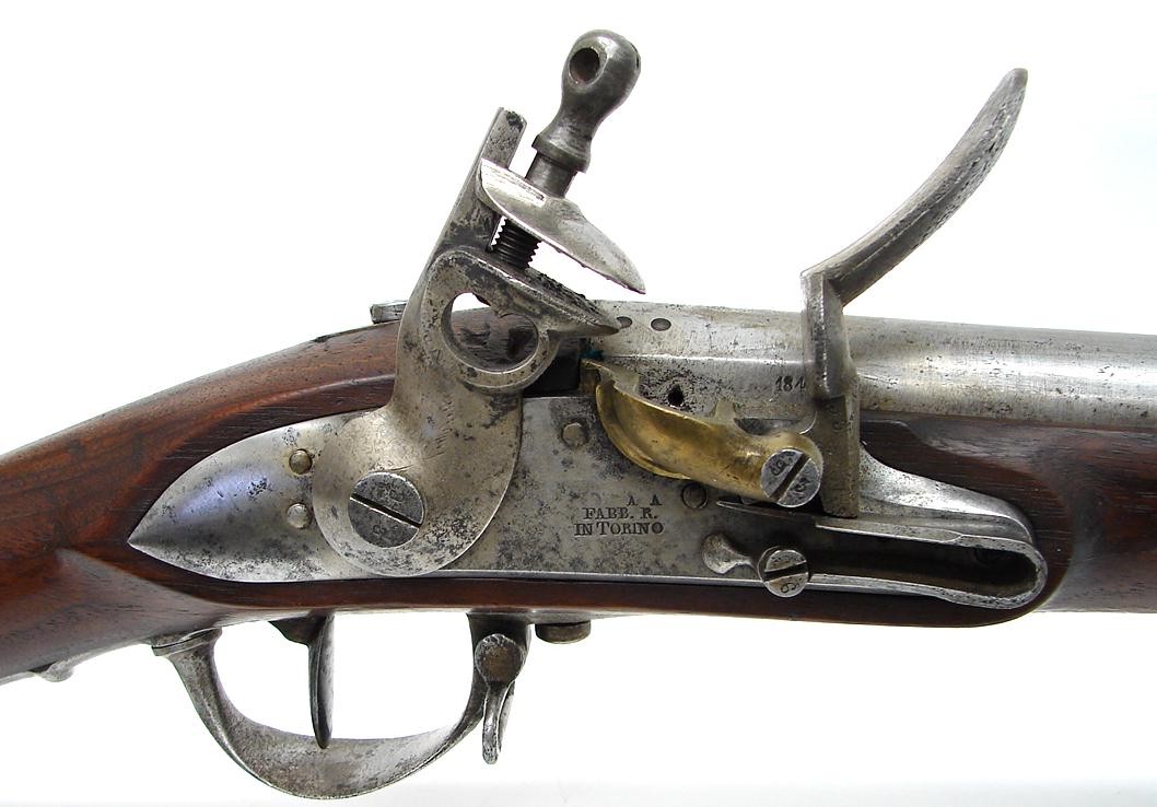Italian Flintlock musket. Lock marked Fabb. R. in Torino. Barrel length is 44. Caliber is approximately .69. Wood and metal are very sharp. Stock has a large circular cartouche dated 1841. Gun is very fine.