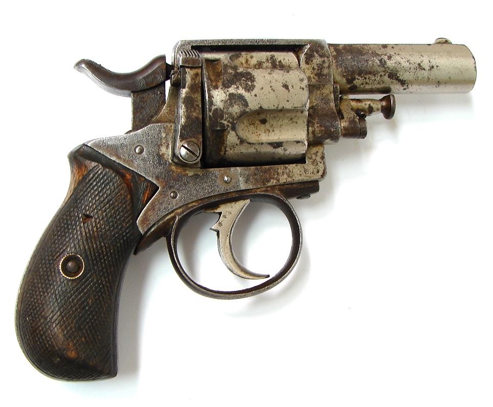 British Bulldog .44 caliber revolver. No British proofs. It does have an usual mark on the left side of frame. It is a "Sun" face and sunburst. Action works fine. Gun has Belgian proofs on back of cylinder.