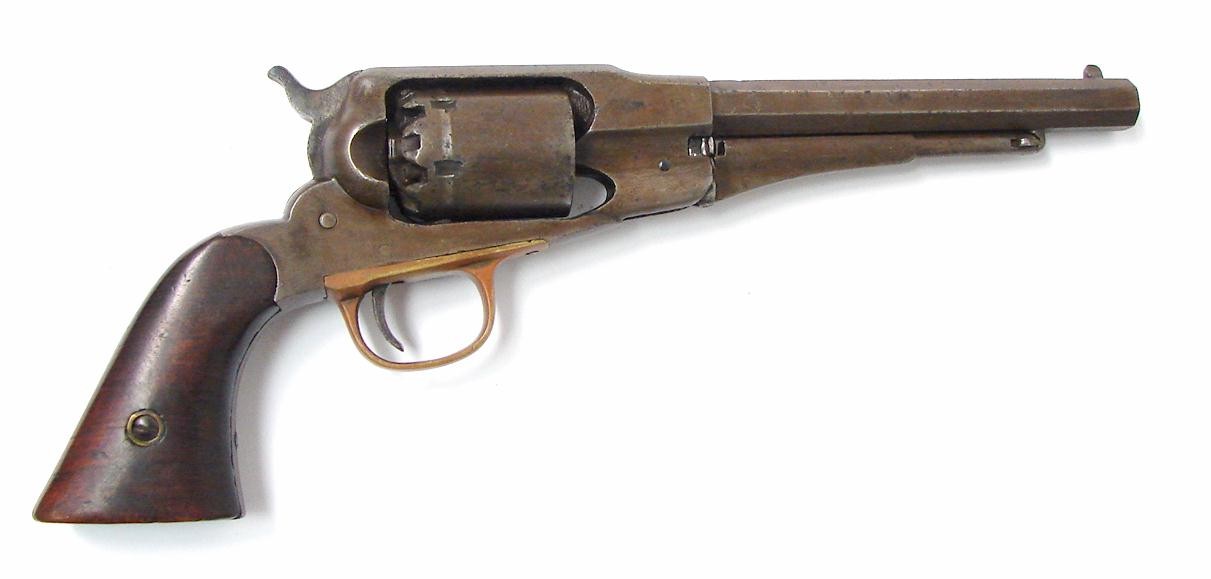 Remington New Navy revolver. Metal has light brown patina with spots of light pitting. Gun indexes but does not lock up. No visible markings on barrel. Only markings are the inspectors marks on left hand side of trigger guard. No visible rifling. Priced to sell.