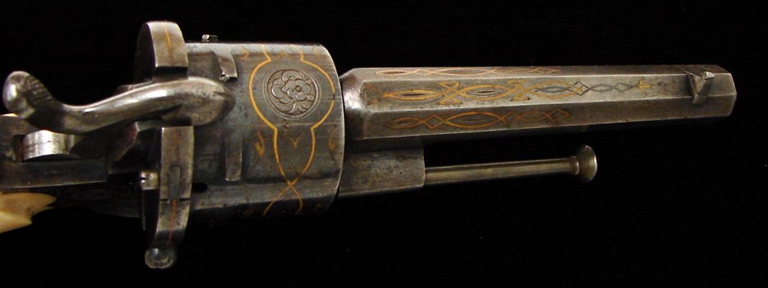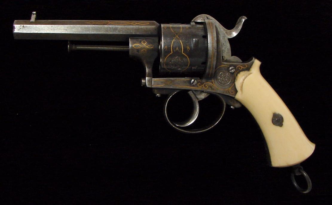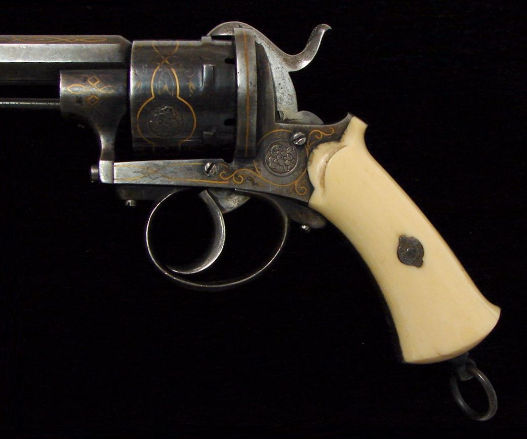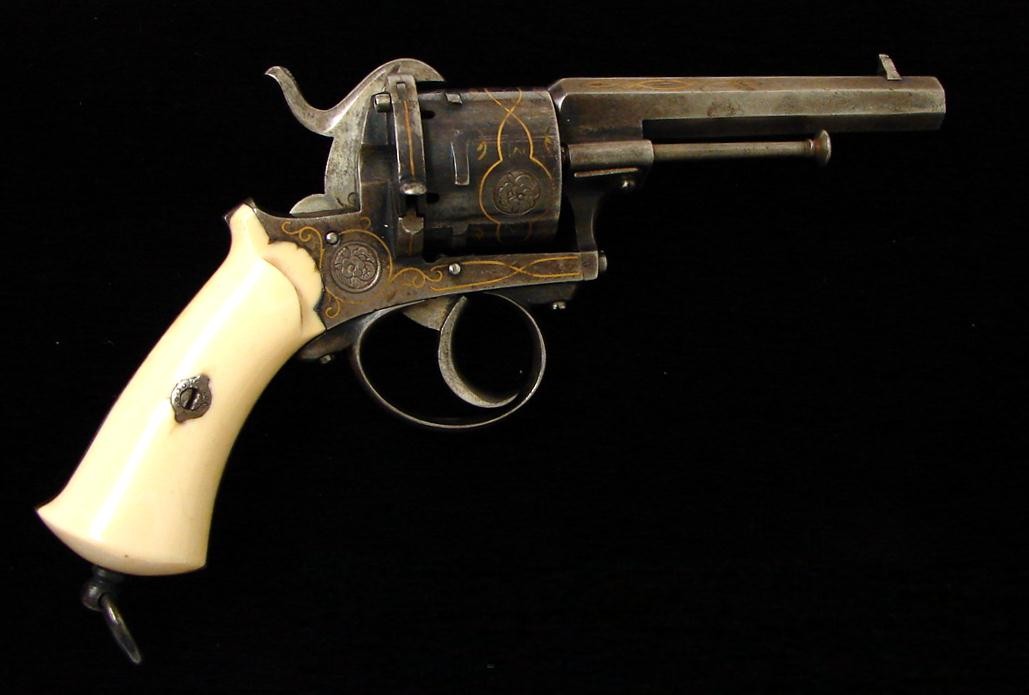 French Pinfire 10mm caliber revolver. Barrel length 4" and overall length 8 1/2". Gun has very fine Ivory grips. Gun is factory (AH3019)