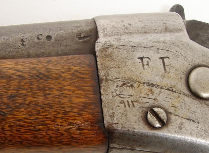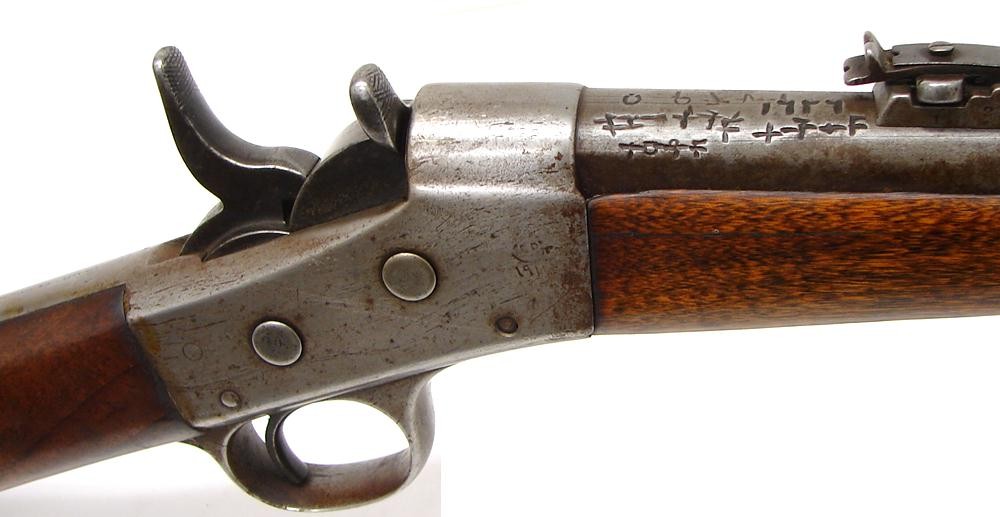 Remington Rolling Block .43 Egyptian caliber rifle. Has an excellent bore (surprisingly). Farsi markings on barrel. Reputedly used by Egyptian border guards. Has crown and Farsi on frame.