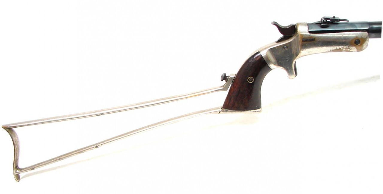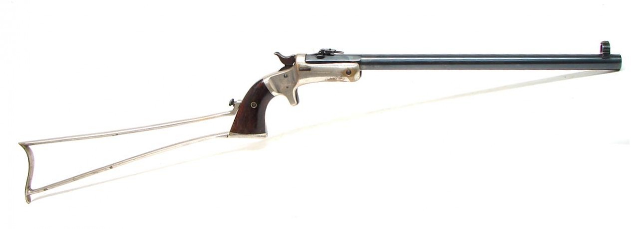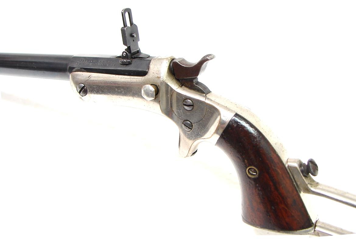 Stevens Pocket Rifle. Barrel has an export old refinish. Frame still has very good original nickel. Bore is excellent. Very attractive gun with the original stock!