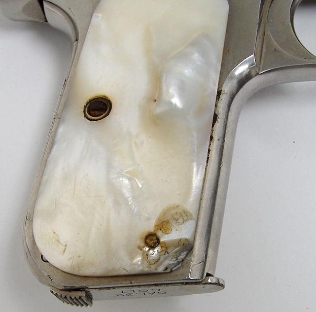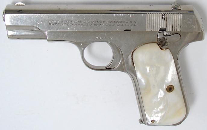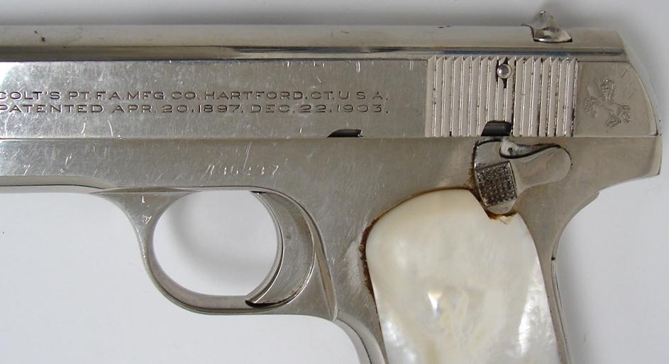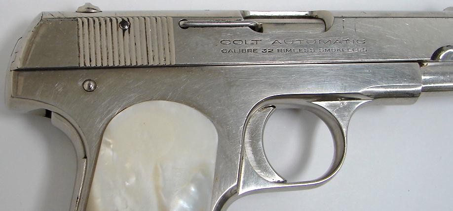 Colt 1903 .32 ACP caliber pistol made in 1923. Factory nickel with pearl grips. Fine condition with very fine marks in nickel finish. One grip is chipped.