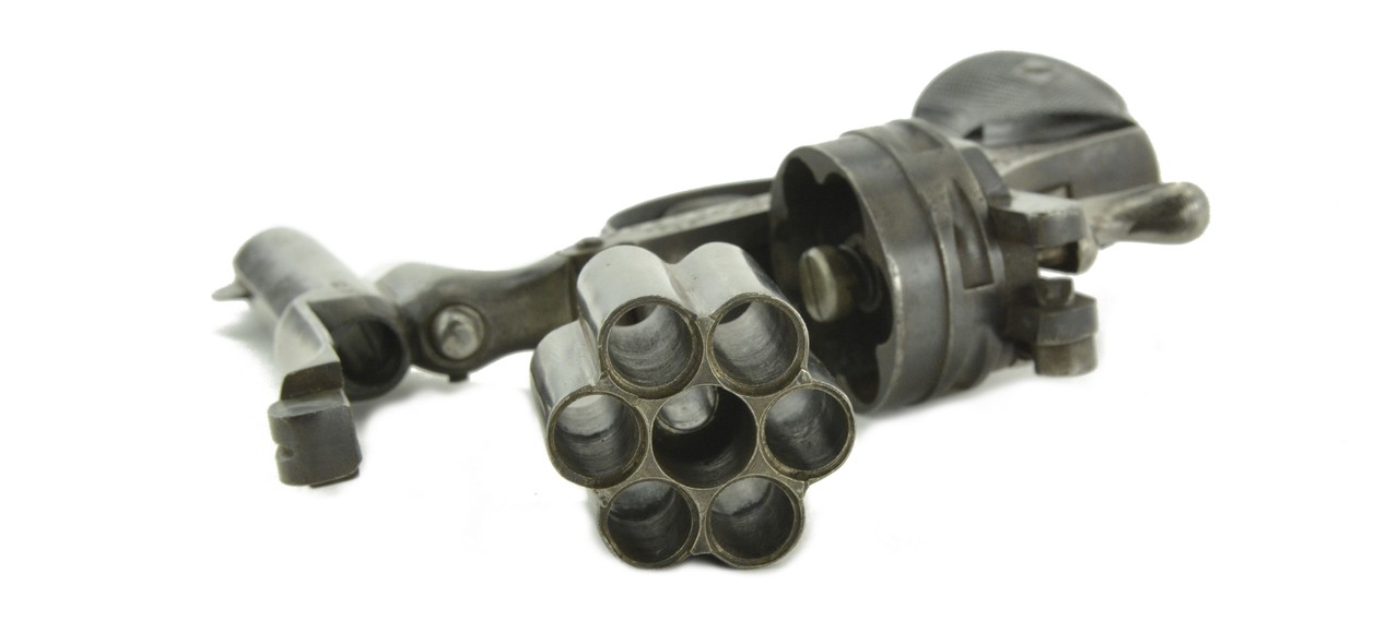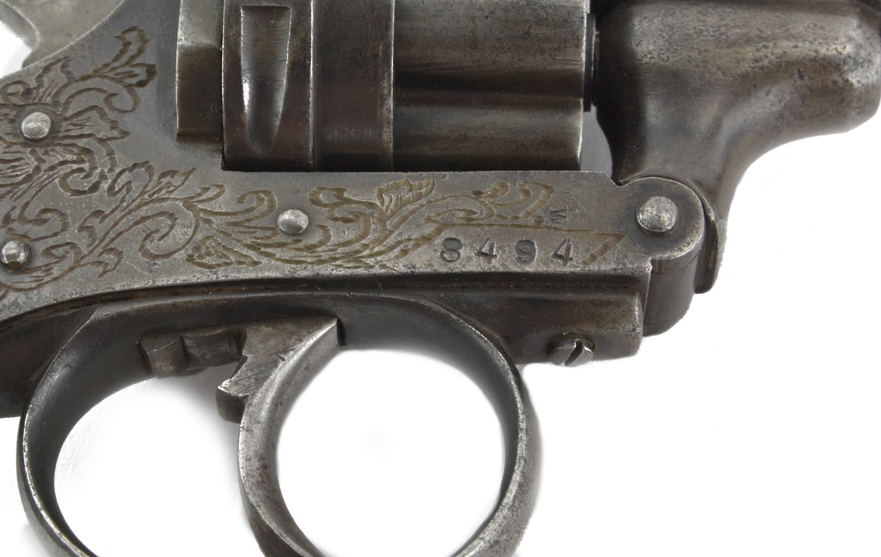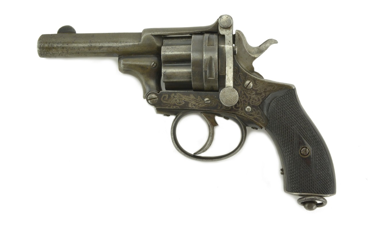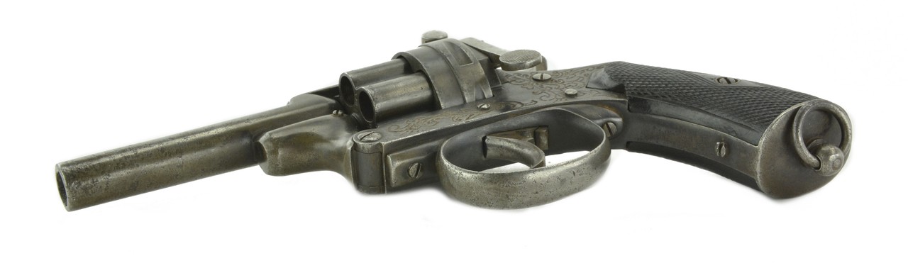 Unusual Belgian Pryse Style revolver with removable cylinder. Very unusual Pryse style gun with a lever on the side to break open the gun. The cylinder comes completely out of the gun. We presume that this gun was sold with extra cylinders that would act like magazines for an automatic because of the ability to switch them out quickly. Gun is nice and sharp and the frame is engraved. Some light pitting in the metal. Blue finish remains in the protected areas. Grips are nice and sharp. Other than Belgian proof marks, this gun is unmarked.