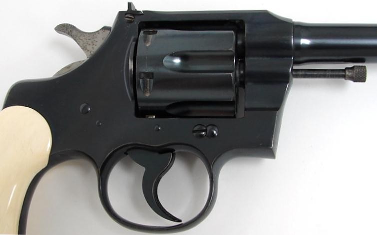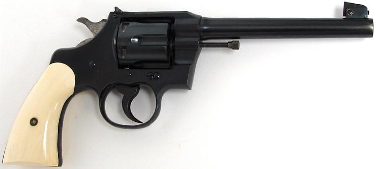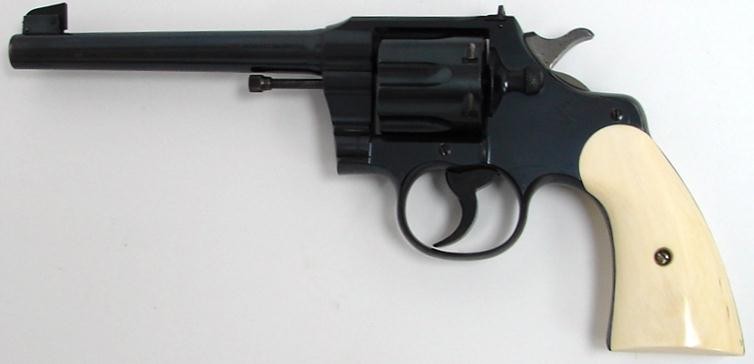 Colt Officers Model .38 Special caliber revolver. Pre-war target model made in 1926. Very good condition with custom ivory grips (c3602)