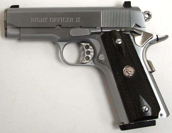 Colt Night Officer II .45 ACP caliber pistol. Special limited edition model with Officers ACP slide on full size frame with factory night sights and hard chrome finish. Has had action work and jewelling by T. Jacobsen. Excellent condition with box.