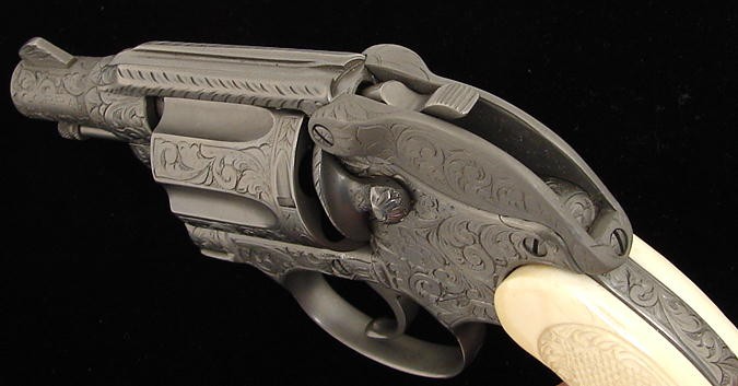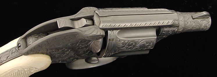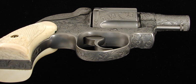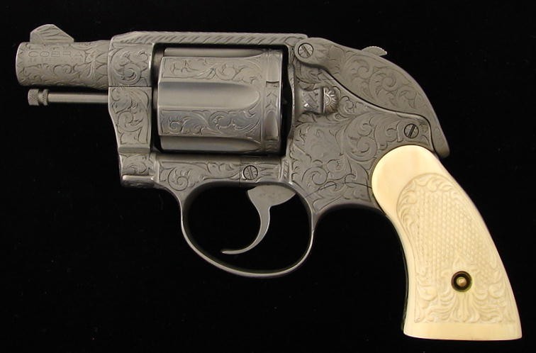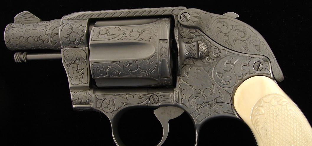 Colt Cobra .38 Special caliber revolver. Fancy little custom engraved lightweight model. Gun has full coverage custom scroll engraving, French grey finish, factory hammer shroud and beautiful custom carved genuine ivory grips. A wonderful pocket gun.