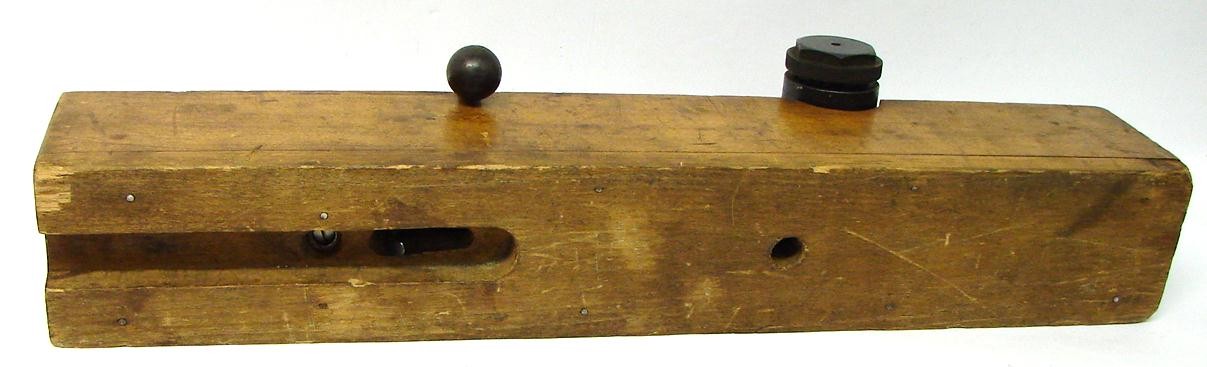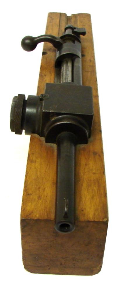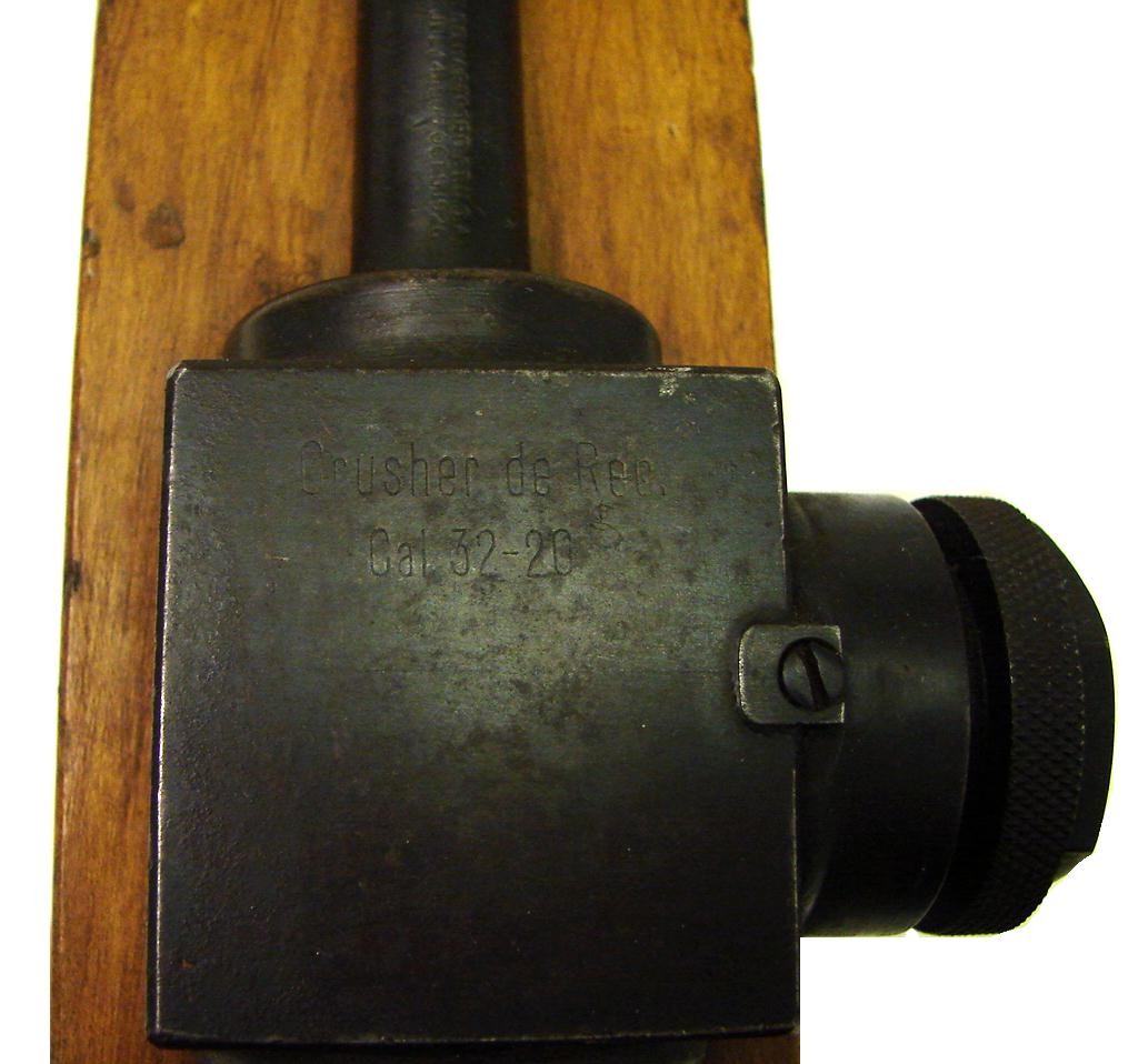 Ammunition Pressure Tester for .32-20 Ammo. Rare. Marked on pressure block "Crusher de Rec. 32-20." Device uses a Colt Official Police 32-20 barrel. Side bolt unscrews to reveal pressure plunger. A lead wafer was inserted and after firing the weapon was removed and gauged to see the pounds per square inch of pressure exerted. Probably around 1910-1920. Trigger actuates from a groove in the bottom of the wood block. Over many years we have sold others in different calibers mounted like this. Devices such as this were used by all ammo manufacturers to check the pressure consistency of their ammo. This one was used in Mexico.