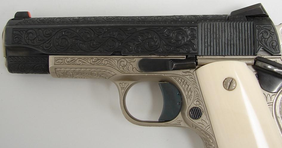 Colt Lightweight Commander 9mm Para caliber pistol. Custom engraved custom carry gun with alloy frame, Novak sights and Ed Brown bobtail grip. Has full coverage scroll, 2-tone finish and genuine ivory grips.