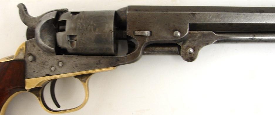 Colt 1849 Pocket revolver with 6 barrel. Serial number 296367. Interesting gun marked S.M.C. Co. No. 7. Very probably a guard gun for an iron and coal company and this could be mine number 7 or gun number 7. Sharp gun with excellent cylinder scene. All matching numbers including the wedge. Very good plus grips with 90% varnish. Very nice inscribed 49 that needs more research!