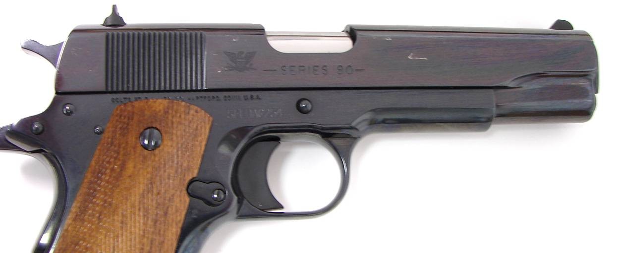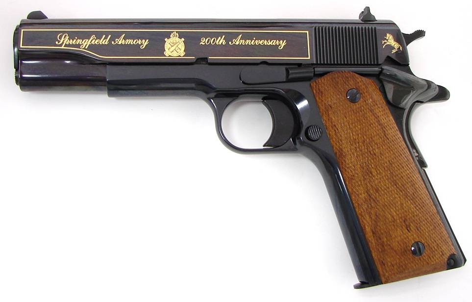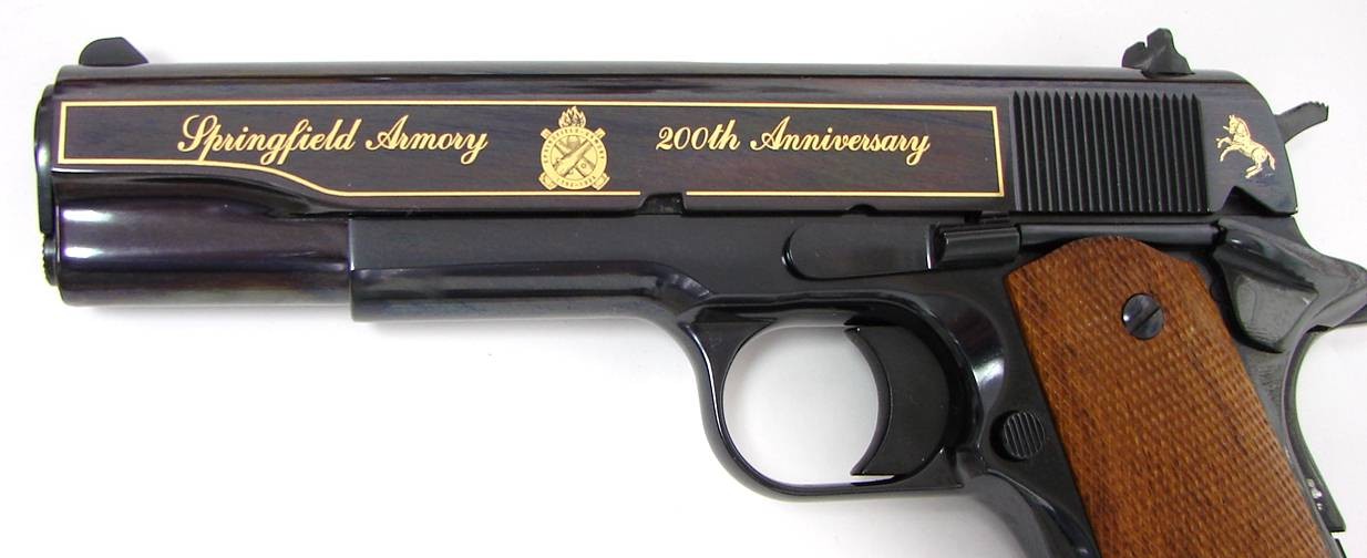 Colt Government .45 ACP caliber pistol. Springfield Armory 200th Anniversary special edition with gold decorations. Has some scuffs on one side of the slide, otherwise excellent condition.