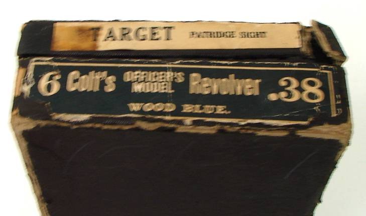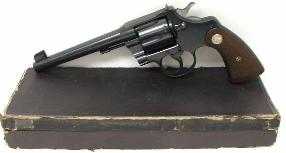 Colt Officers Target .38 Special caliber revolver. Early post-war officers model target made in 19148. Excellent condition with pre war box numbered to the gun. Box has the original target dated 10-05-1948 and numbered to the gun. All box labels are correct. Box has scuffs and glue repairs to the corners. Gun is 99% original.
