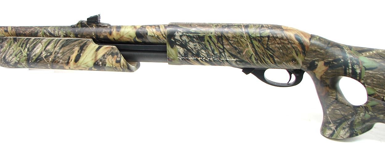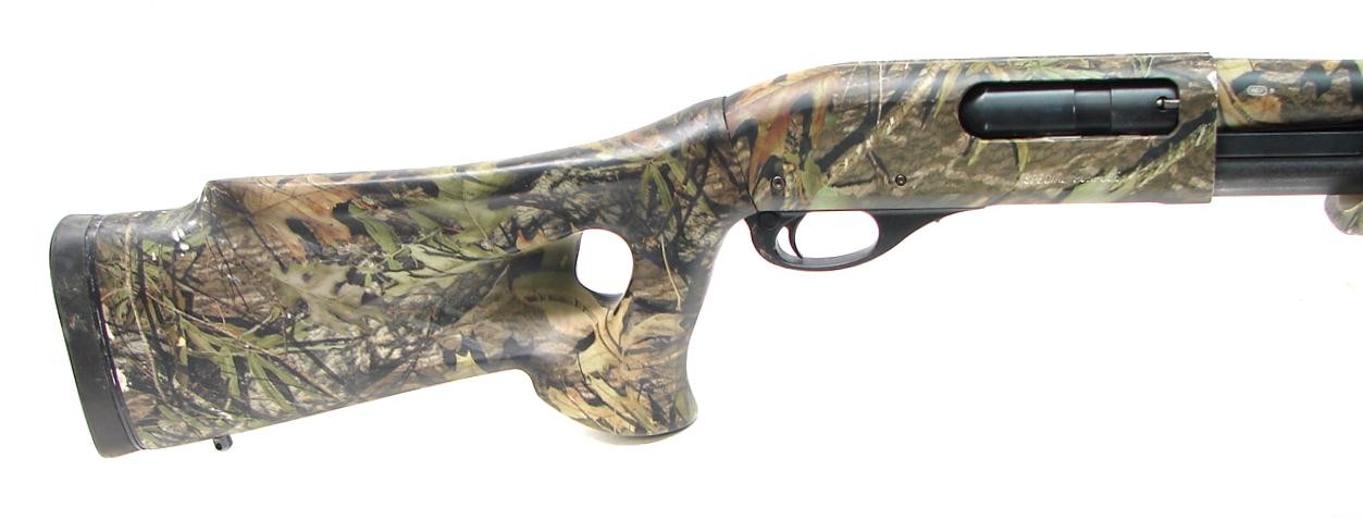 Remington 870 Super Magnum 12 gauge shotgun. 3 1/2" Magnum Turkey Gun with 23" barrel, camo finish, thumb hole stock and fiber optic sights. Excellent condition.