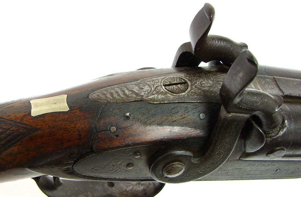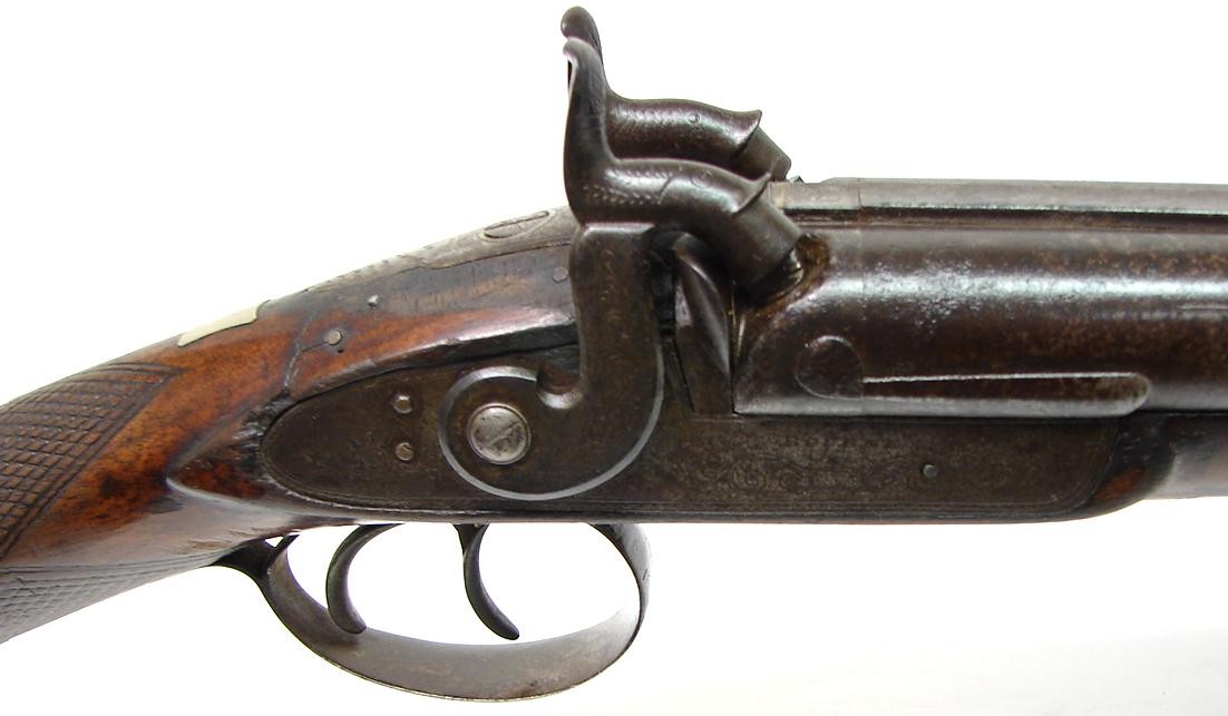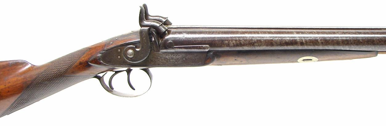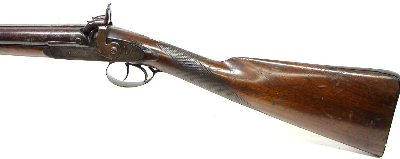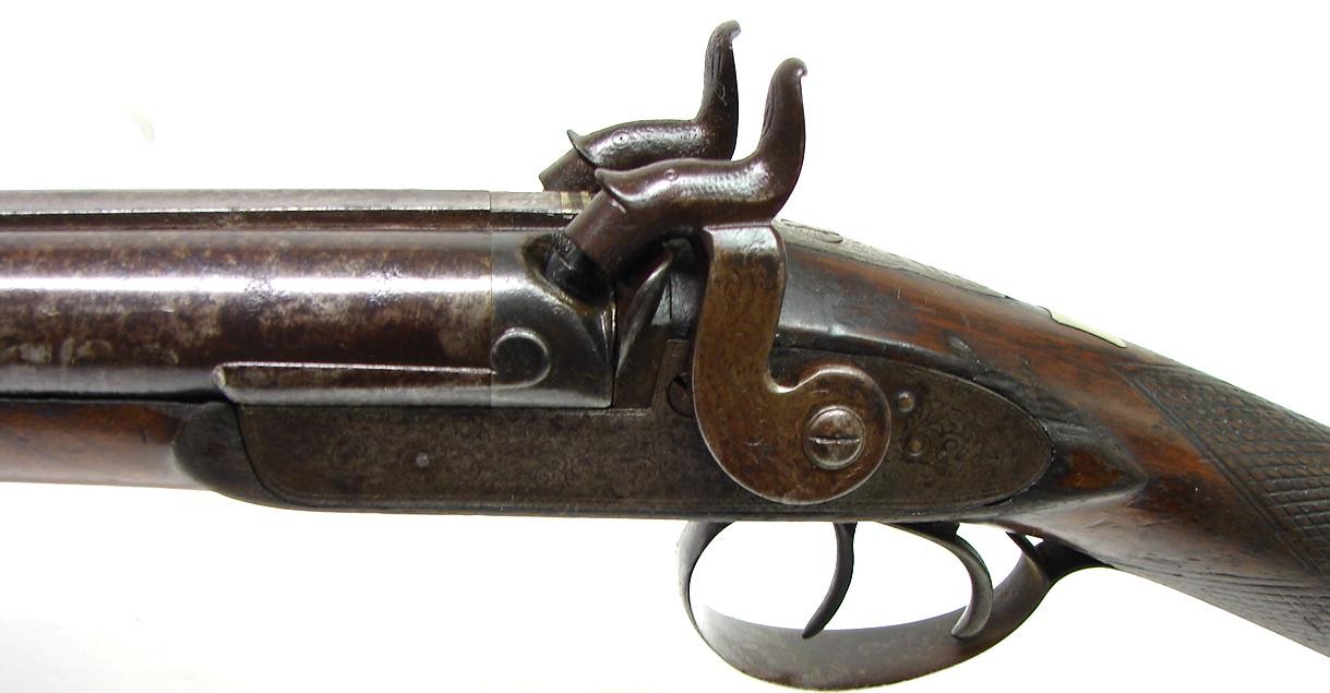 American Percussion 12 gauge double barrel shotgun by Bourne. Action works fine and barrels have very good Damascus pattern. Forend ramrod finial is missing. Very good looking percussion double.