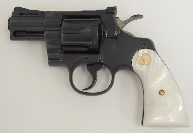 Colt Python .357 Magnum caliber revolver. Rare 2 1/2 model in excellent condition with fancy aftermarket pearlite grips.