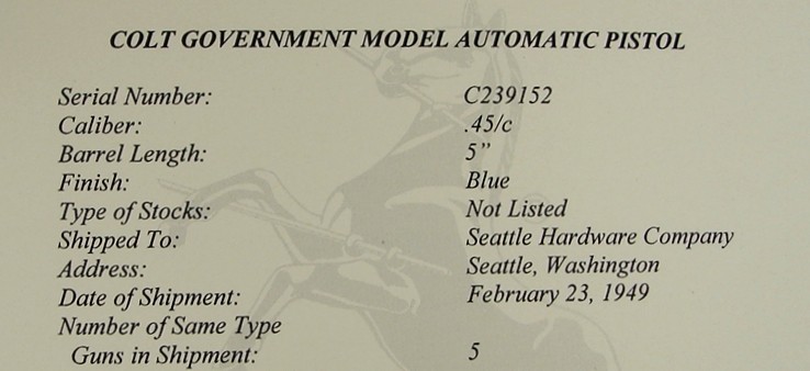 Colt Government Model .45 ACP caliber pistol. Very early post-war model made in 1949. The gun is in excellent condition with about 97% original blue, box, papers and extra mag. A very nice example of an early commercial gun with factory letter.