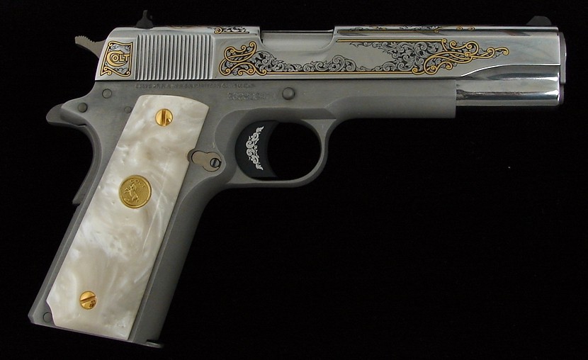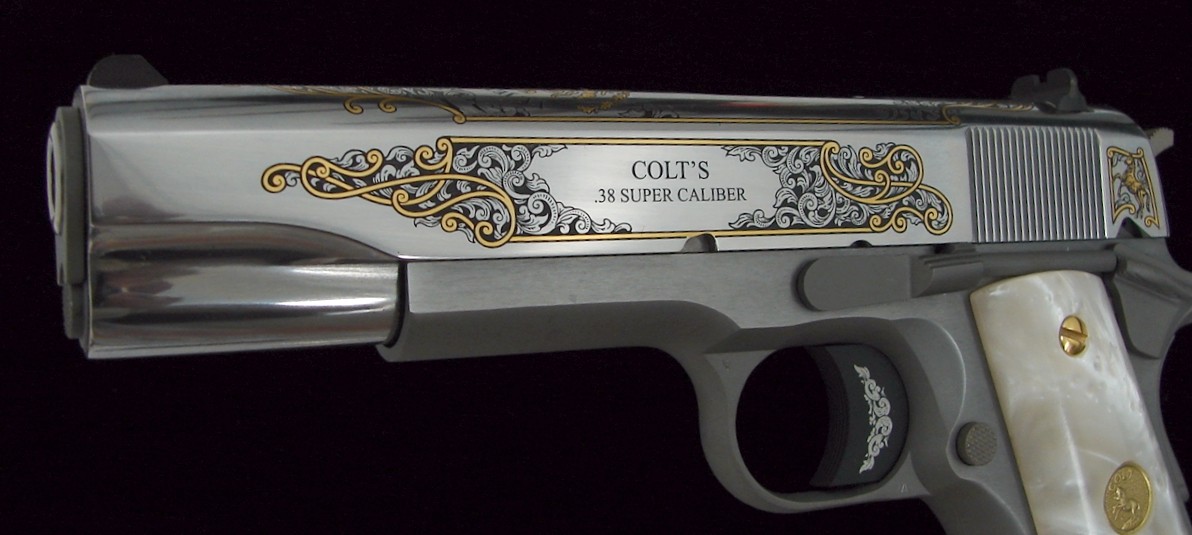 Colt Government Model .38 Super caliber pistol. Limited edition El Jefe De Jefes with bright stainless gold engraved slide wit (c5452)