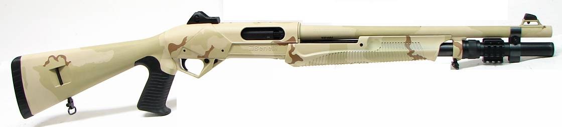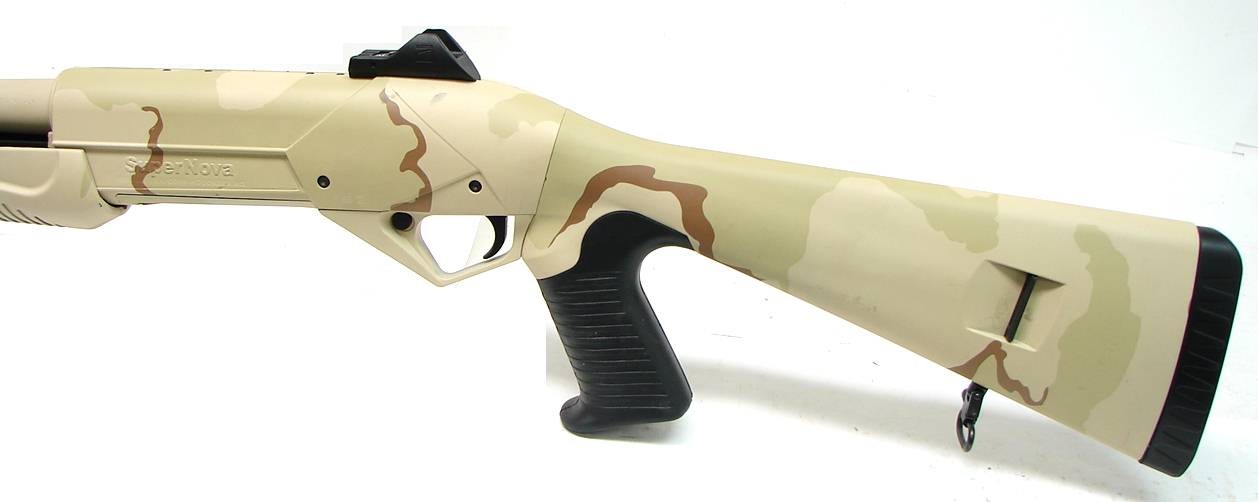 Benelli Super Nova 12 gauge shotgun. Tactical pump riot gun with desert camo finish, ghost ring sights and pistol grip stock. Excellent condition and extended mag tube.