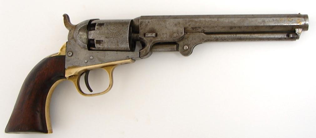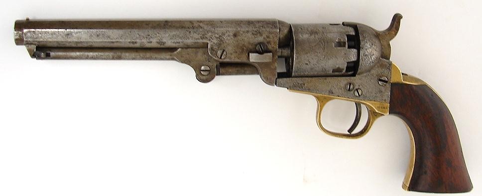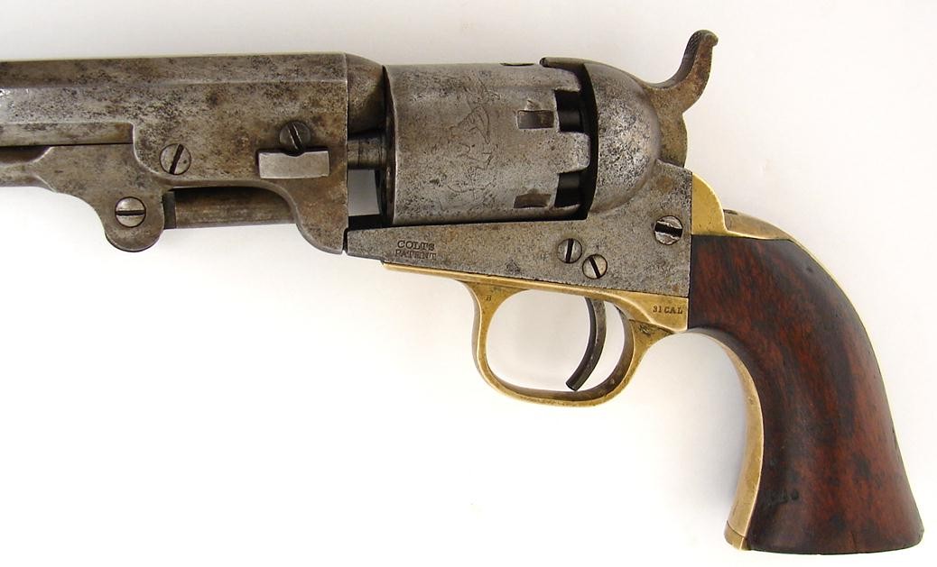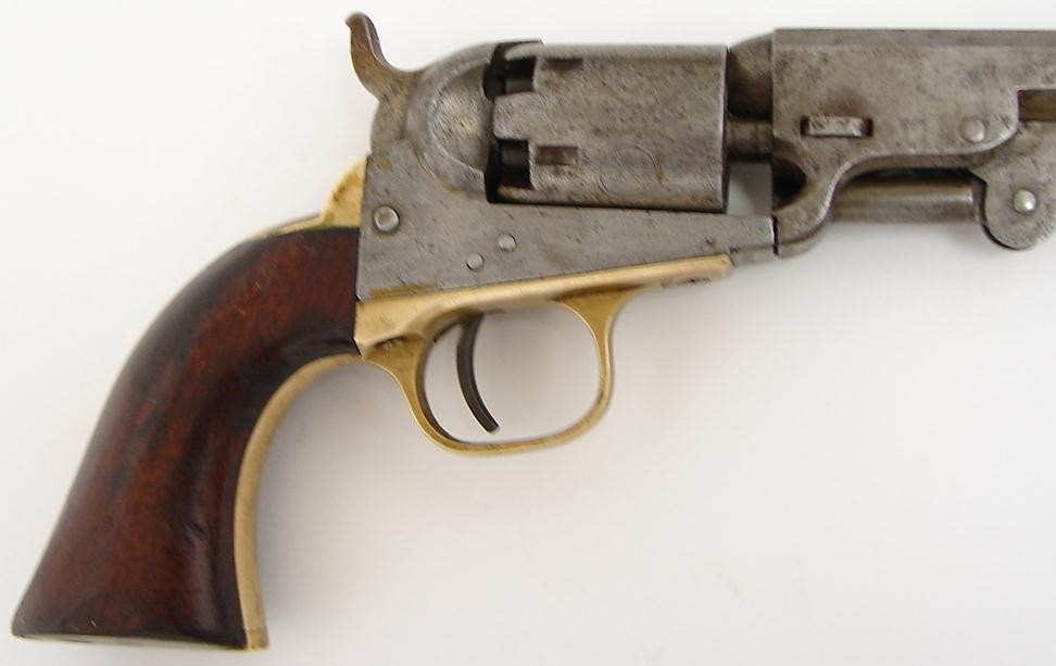 Colt 1849 pocket revolver. This gun has a smooth gray patina with some light pitting. Cylinder scene is still visible and the grips remain very good.