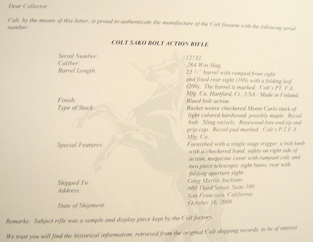 Colt/Sako L61R .264 Win mag caliber rifle. Rare prototype Sako deluxe rifle made for Colt with Colt markings on the barrel and Colt pony etched on the floor plate. Has iron sights and scope bases. A very unusual piece with factory letter stating it was a display piece kept by the factory.