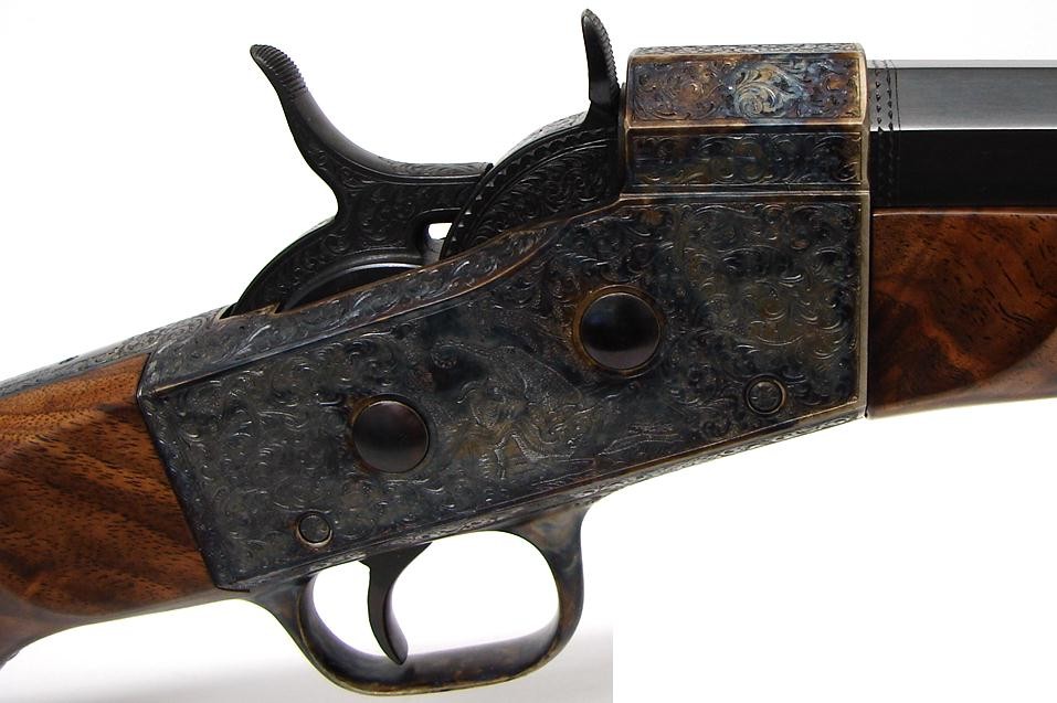 Pedersoli Rolling Block .45-70 caliber rifle. 120th Anniversary of the Creedmoor rifle special edition. Has beautiful full coverage engraving on the receiver and fancy high grade walnut stock 34 half round, half octagon. Excellent condition with box.